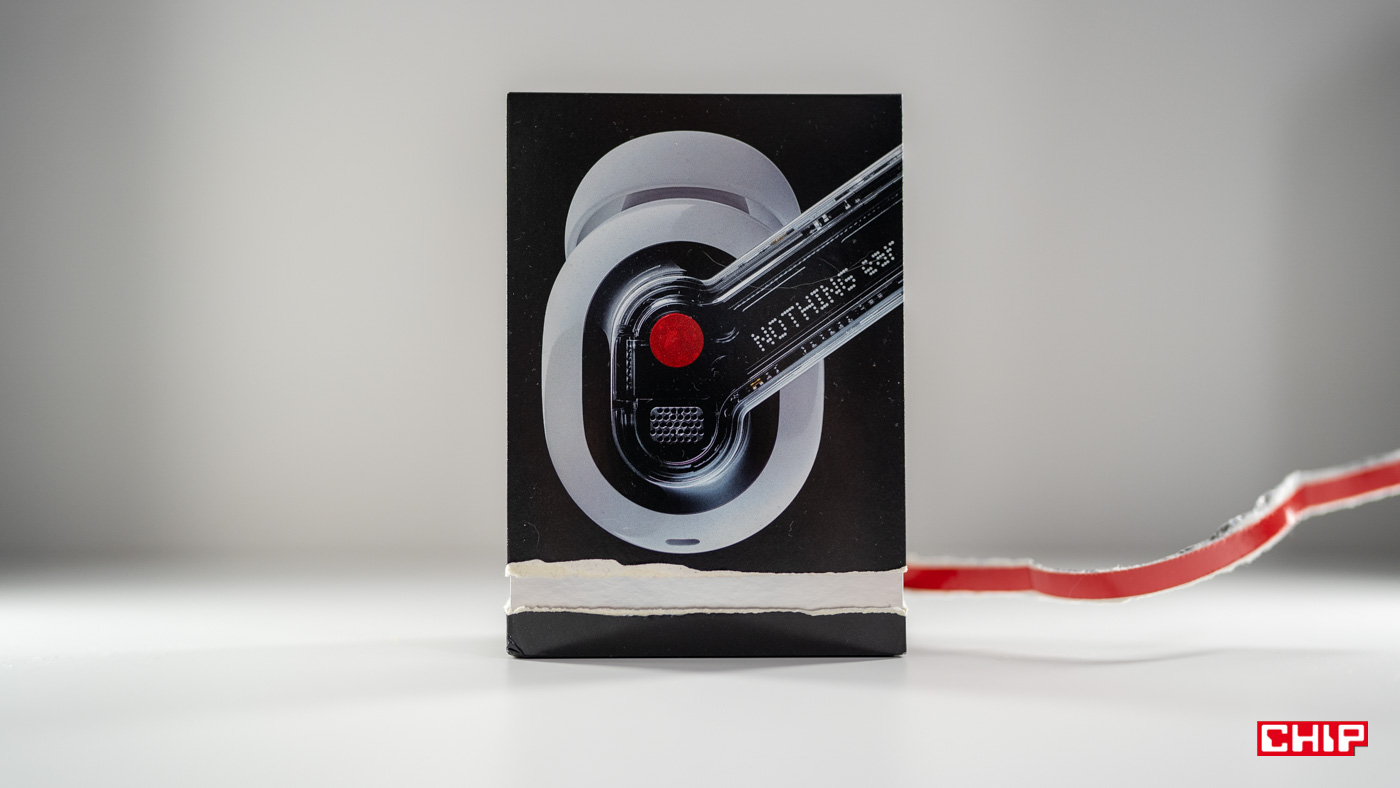 Przygoda z pierwszym produktem firmy Nothing zaczyna się z inaczej niż te, do których przyzwyczaili nas inni producenci. Nothing ear 1 trafia do nas w stylizowanym w ciekawy sposób pudełku, którego kartonowej obwoluty nie otwieramy, a rozrywamy za sprawą wzmocnionego folią podłużnego fragmentu. Wtedy dopiero możemy wysunąć z niej srebrną, solidną szkatułkę, która skrywa tradycyjne już dla słuchawek TWS akcesoria – krótki przewód USB-A i USB-C do ładowania, dwie pary dodatkowych gumek w rozmiarach S/L, krótką instrukcję obsługi oraz informacje na temat bezpieczeństwa.
