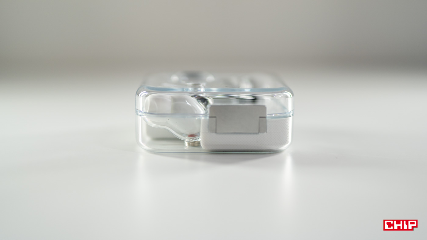 Po zapoznaniu się ze wszystkim tym, co najważniejsze, z pewnością przez kilka długich minut będziecie podziwiać wykonanie, projekt i materiały ear 1. Nie bez powodu, bo innych takich True Wireless Headphones na rynku nie znajdziecie. Wzrok przykuwa nie tylko przezroczyste etui, ale też skrywająca jego tajemnice biała wstawka. Ta jest okraszona malutkimi krążkami i ukrywa głównie akumulator. Moim zdaniem zastosowanie jej było bardzo dobrym wyborem – nie przeszkadza ogólnemu projektowi, a co więcej, pomaga mu nabrać jeszcze bardziej unikalnego charakteru.