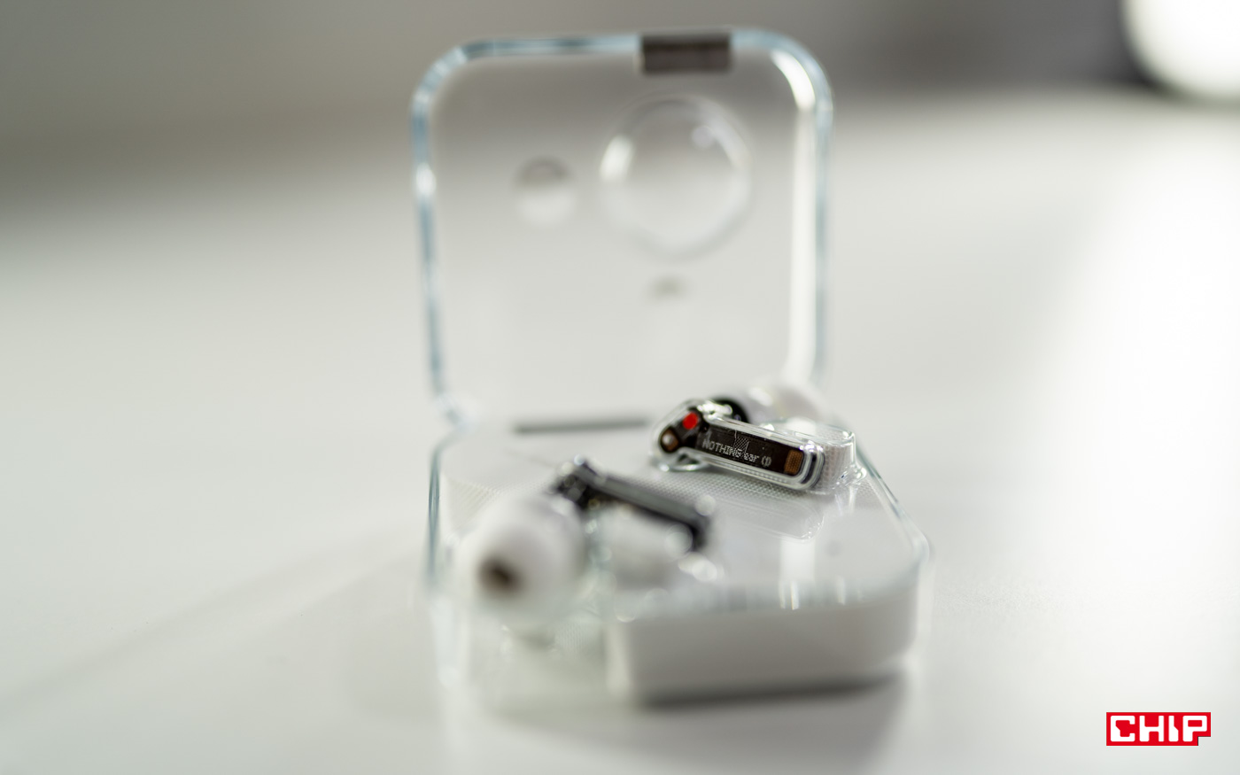 Nothing ewidentnie inspirował się wersją Pro słuchawek Airpods od Apple, co widać zarówno w wyglądzie przezroczystego pałąka, jak i czarno-białej, obłej obudowie, która ląduje w naszych małżowinach. Nie jest to kopia 1:1, ale jeśli Airpods Pro leżały Wam w uszach dobrze, to możecie być pewni, że 4,7-gramowe ear 1 również będą. Zwłaszcza że są dobrze wyważone i posiadają dobrej jakości jakości silikonowe gumki, oferując jednocześnie wytrzymałość na poziomie IPX4.