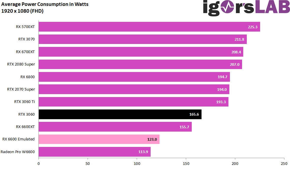 Finalnie, aby odpowiedzieć na pytanie, co do zaoferowania będzie miał RX 6600 dla graczy, wersję Pro W6600 podkręcono tak, aby odpowiadała prawdopodobnemu poziomowi TDP rzędu 130 W. Było to równoznaczne z podbiciem zegara bazowego do 2331 MHz, zegara Boost do 2580 MHz i pamięci do 16 GB/s. W ramach tego typu zabawy wykazano, że prawdopodobna wydajność Radeon RX 6600 w grach wynosiłaby o około 4% mniej względem konkurencyjnego GeForce RTX 3060 przy rozdzielczości 1920×1080.