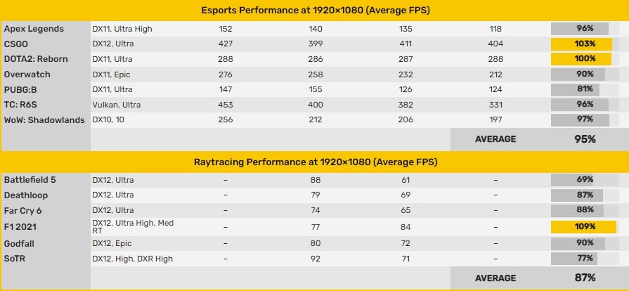 Dlatego też w ujawnionych szczegółach wydajności, AMD porównało swojego Radeona RX 6600 z GeForce RTX 3060. W tej walce karty szły praktycznie łeb w łeb, będąc raz wydajniejszymi w jednej, a raz w drugiej grze, ale zamykają się w widełkach od -12 do 14% różnicy wydajności.