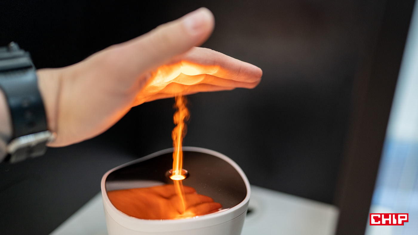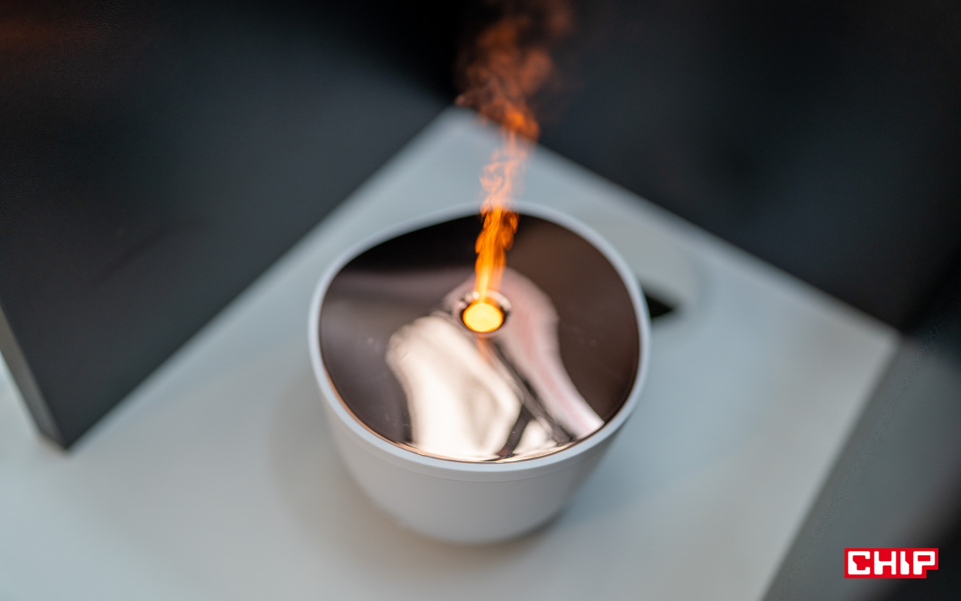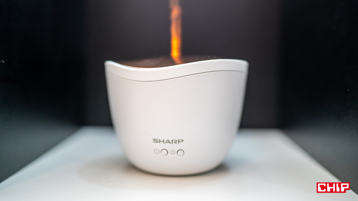 Aromatyzer Sharp DF-A1E-W to przepiękne urządzenie. Jest bardzo proste. Wlewamy do niego aromat, który jest wydmuchiwany otworem na górze obudowy. Cały bajer opiera się na podświetleniu LED, regulowanym w 3-stopniowej skali. Po włączeniu go całość wygląda, jakby z wylotu powietrza unosił się płomień, którego rozmiary zmieniają się wraz ze zmianą siły podświetlenia.