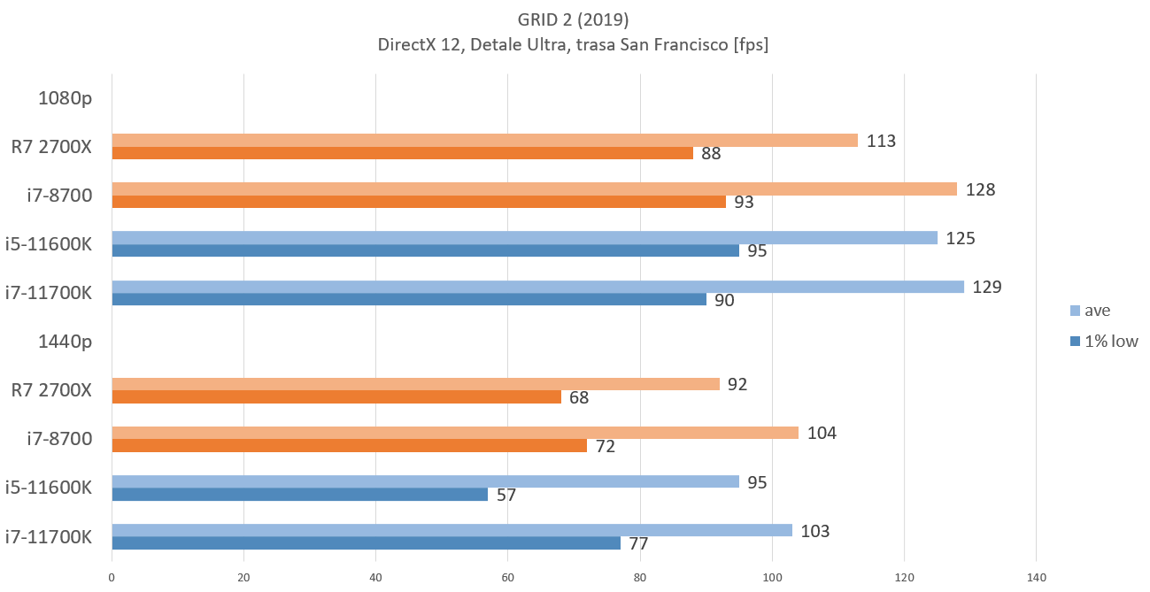 Rezultaty w Cyberpunk 2077 zaskakują. Zdecydowanie wąskim gardłem okazał się RTX 3060, ale mimo tego wyniki osiągnięte przez Ryzen 7 2700X wprawiają w osłupienie. Szczególnie jeśli popatrzymy na delikatnie spadającą tendencję wartości 1% low wśród procesorów Intela. Natomiast w GRID wyjątkowo dobrze poradził sobie i7-8700, szczególnie jeśli popatrzymy na wyniki nowszych jednostek. Mimo wszystko ponownie komponentem hamującym komputer była karta graficzna.