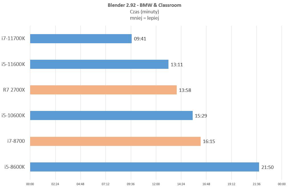 Aplikacja Blender służąca do renderowania animacji to mój ulubiony sprawdzian prawności zestawu komputerowego. Benchmark Quick polega na rednerowaniu scen BMW i Classroom w jak najkrótszym czasie. Im więcej rdzeni pod ręką tym lepiej dla użytkownika. Po przesiadce na nowszą wersję widać, że aplikacja poczyniła znaczące postępy w kwestii optymalizacji, ponieważ poprawa w przypadku obu rywali jest nader wyraźna. Dla i7-8700 to o 28% skrócony czas a Ryzen upora się z zadaniem szybciej o 27% względem wersji 1.0. W przypadku dużych projektów oznacza to niemałą oszczędność czasu spędzonego przed ekranem.