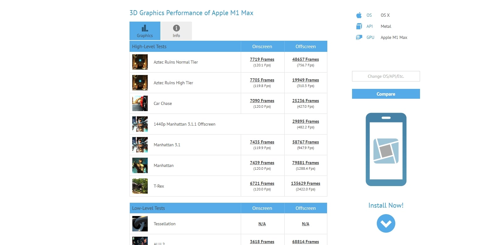 Jednak podczas prezentacji Apple mierzyło wyżej i stwierdziło, że procesor graficzny M1 Max (o TDP 60 W) rywalizuje z mobilnym GeForce RTX 3080 (160 W). Problem w tym, że te porównania są ponoć wykonane na bazie „wybranych standardów branżowych”, co oznacza tyle… co nic. Dlatego też w rzeczywistości poniższy test GFXBench jest pierwszym racjonalnym wynikiem wydajności GPU M1 Max, który został przetestowany na systemie Mac OS X z API Metal i stanął w szranki z mobilnym GeForce RTX 3080 i Radeonem RX 6800M. Te karty zostały z kolei przetestowane w systemie Windows i interfejsie OpenGL API.