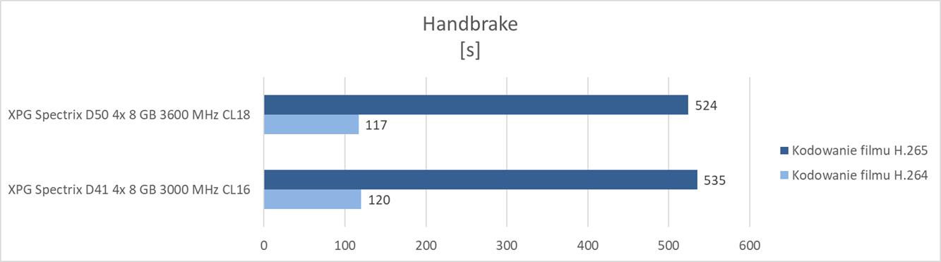 Testy przeprowadziłem w 5 programach oraz w 5 grach. Wykorzystałem tutaj Cinebench R23 – test jednowątkowy i wielowątkowy. W przypadku 7-zip sprawdziłem ile trwa pakowanie 1353 plików o wadze 2,92 GB oraz 1 pliku o wadze 9,31 GB. Testy Handbrake polegały na sprawdzeniu czasu konwersji filmu .mp4 o długości 10 minut i 33 sekund do H.264 i H.265 (1080p30). W Corona Benchmark i V-Ray Benchmark wykorzystałem testy udostępnione przez producentów.