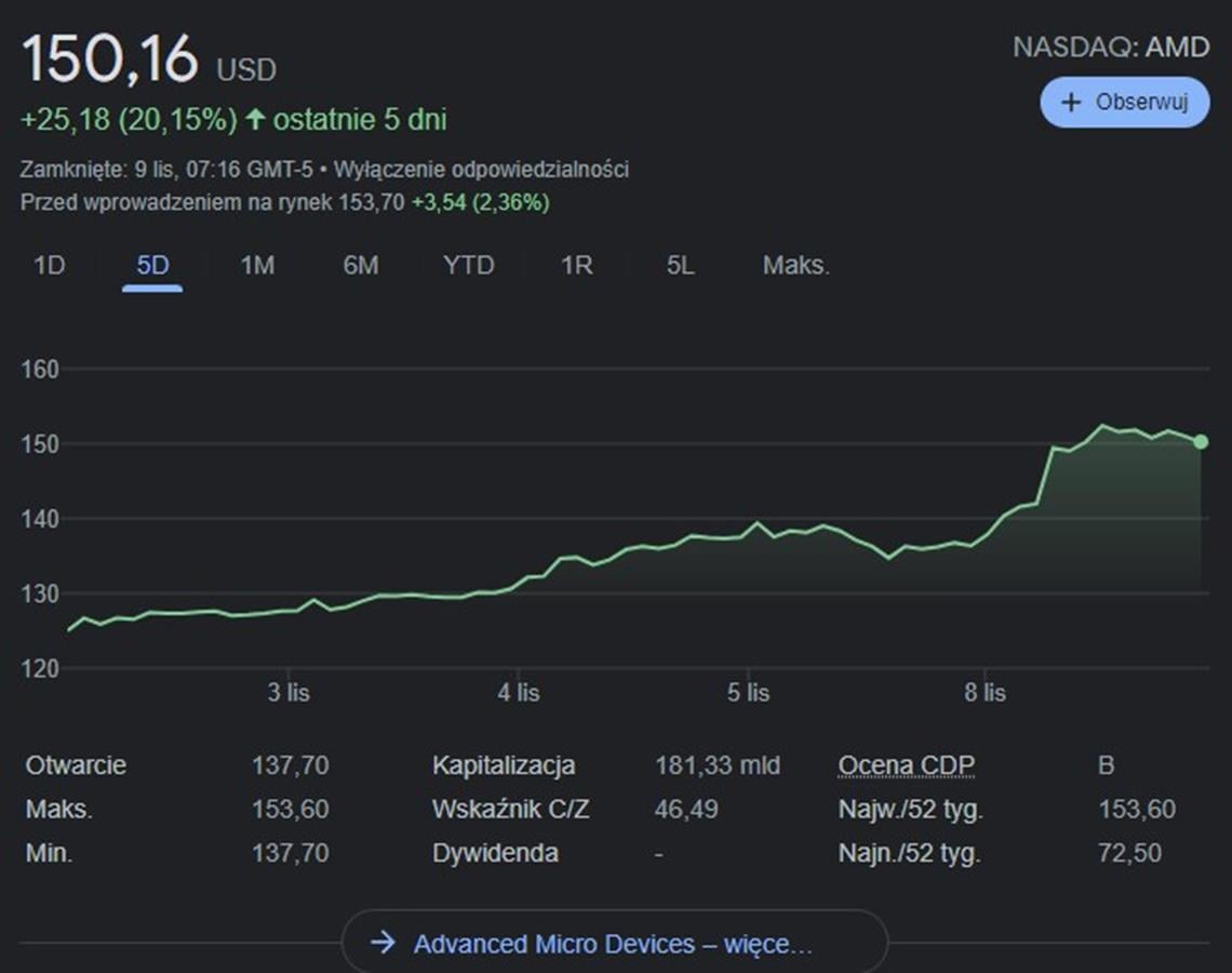 Efekty konferencji AMD widać nie tylko na papierze cyfrowym, ale też tym finansowym, bo po tym, jak firma ogłosiła swoją umowę z Meta, czyli dawnym Facebookiem, jej wartość znacznie wzrosła. Nic jednak w tym dziwnego, bo tego typu umowa może zakończyć się ogromnymi wręcz zakupami sprzętu AMD, jako że Meta chce z czasem dorównać gigantom pokroju Microsoftu, Azure, czy Google Cloud. To z kolei oznacza jedno – ogromne plany zakupowe i na to właśnie rynek stosownie zareagował.