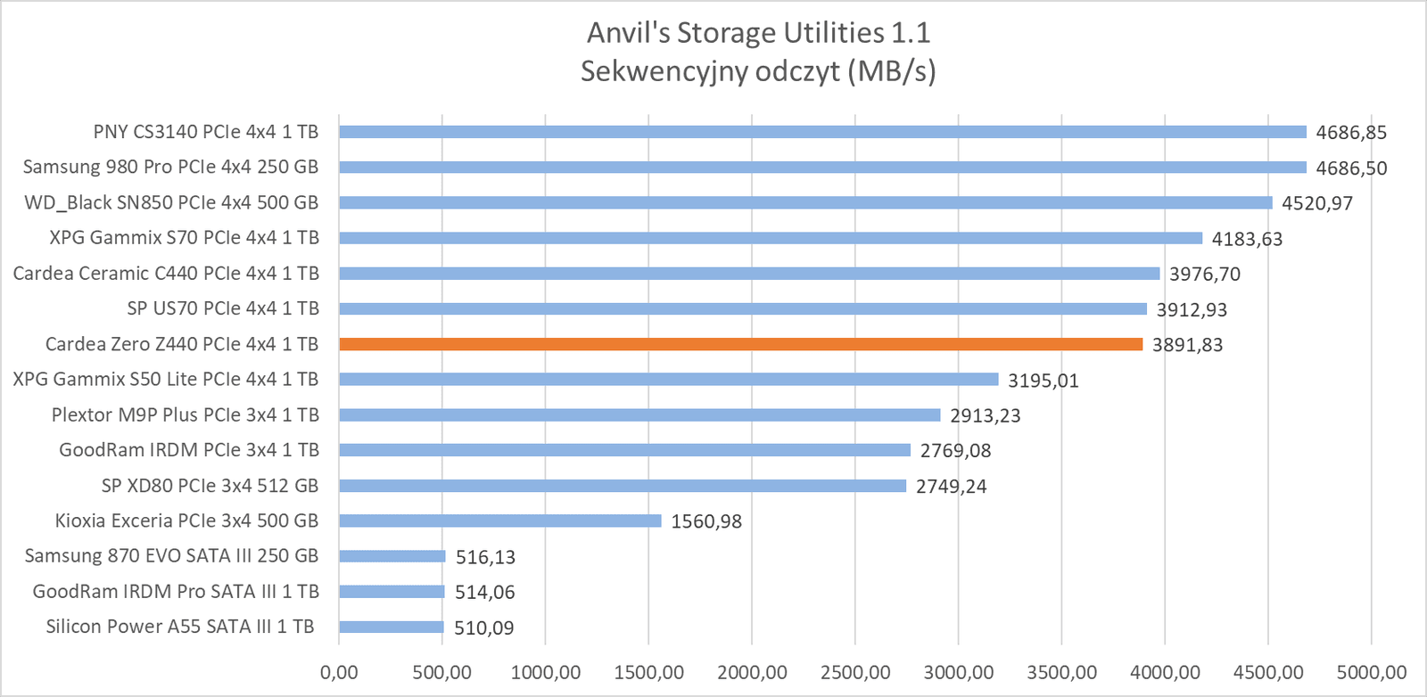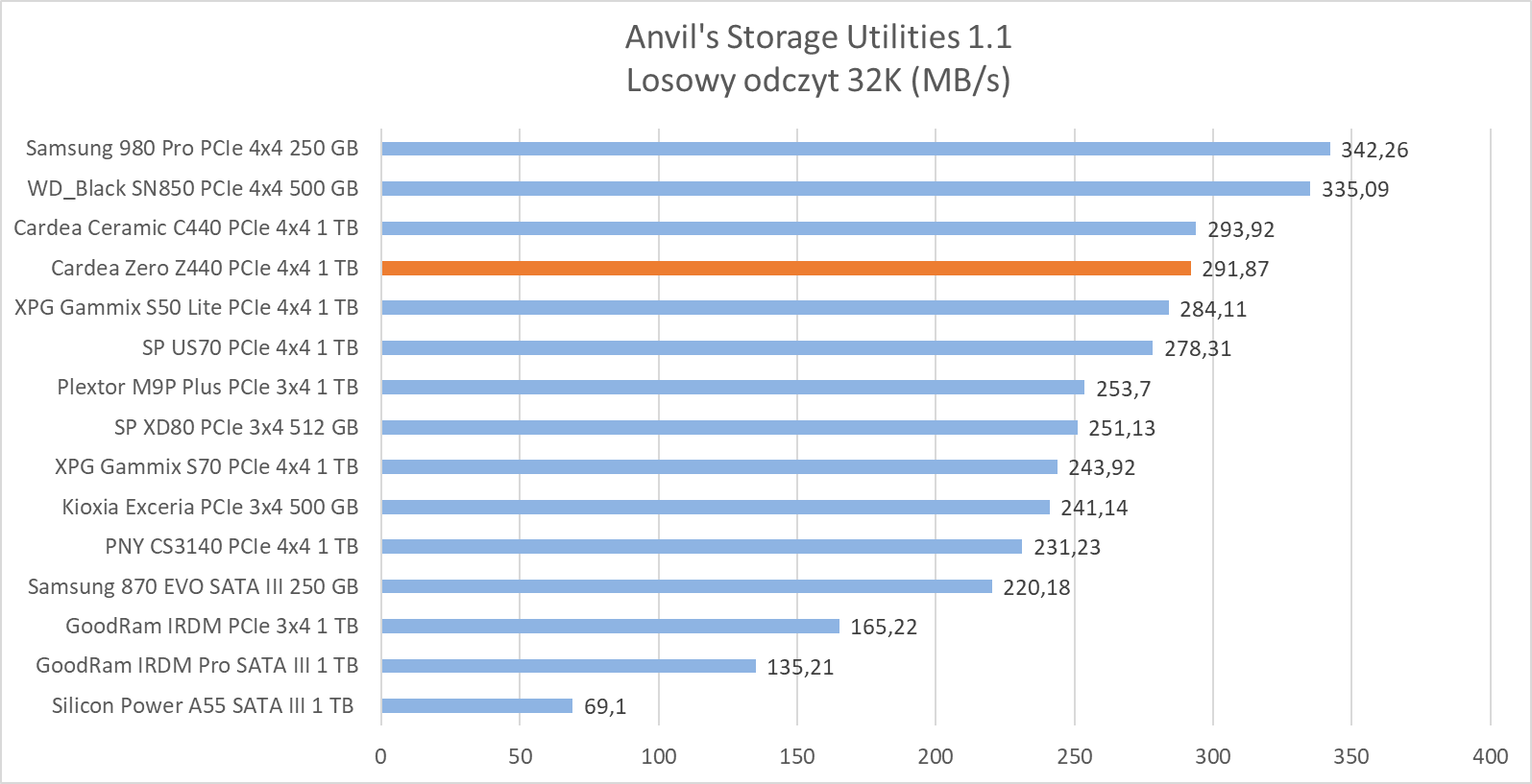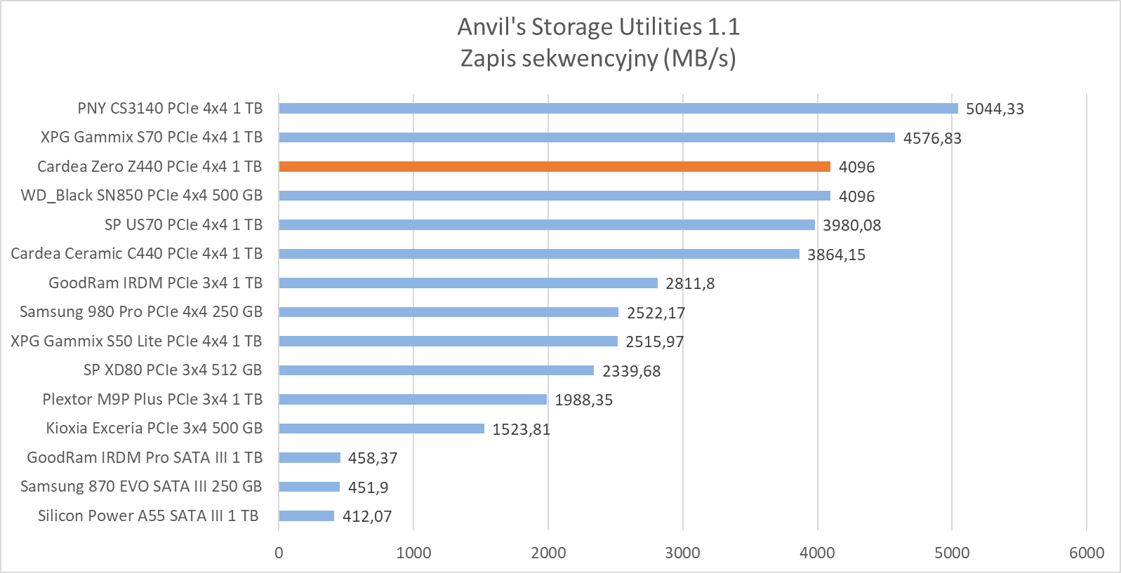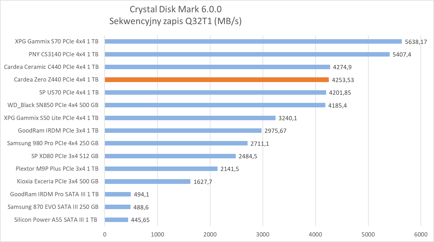Nasza baza danych obejmuje już sześć dysków w tej konfiguracji (wliczając dziś testowany). Na ich tle Cardea Zero Z440 wypada zadziwiająco dobrze zwłaszcza przy operacjach zapisu. Odczyt wypada z kolei oczekiwanie.