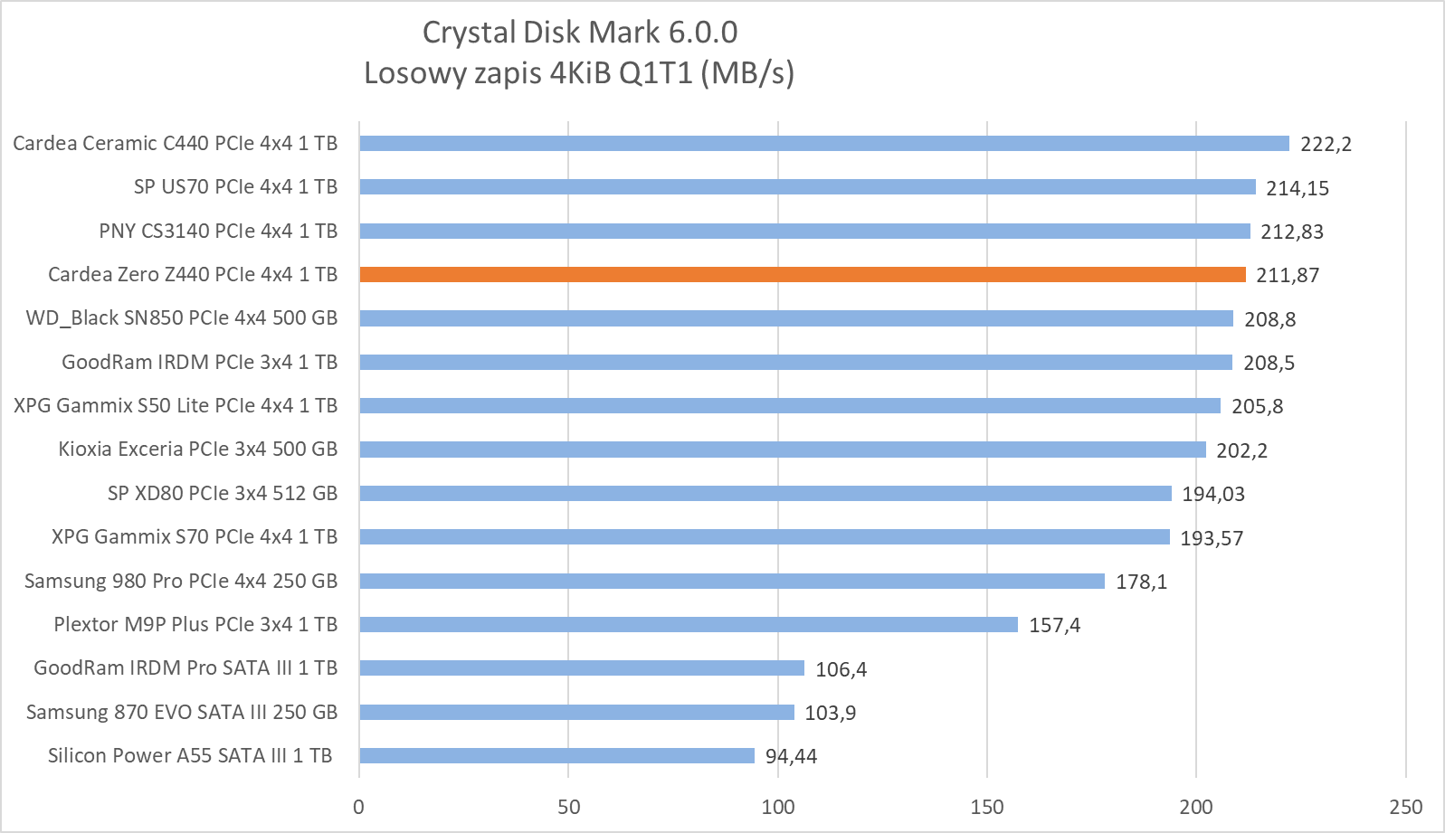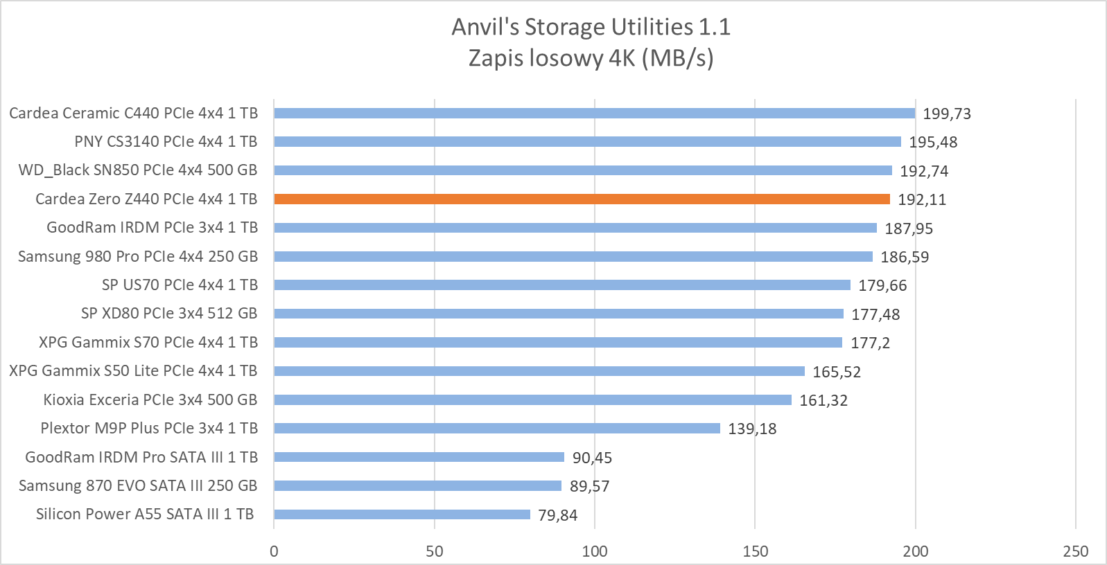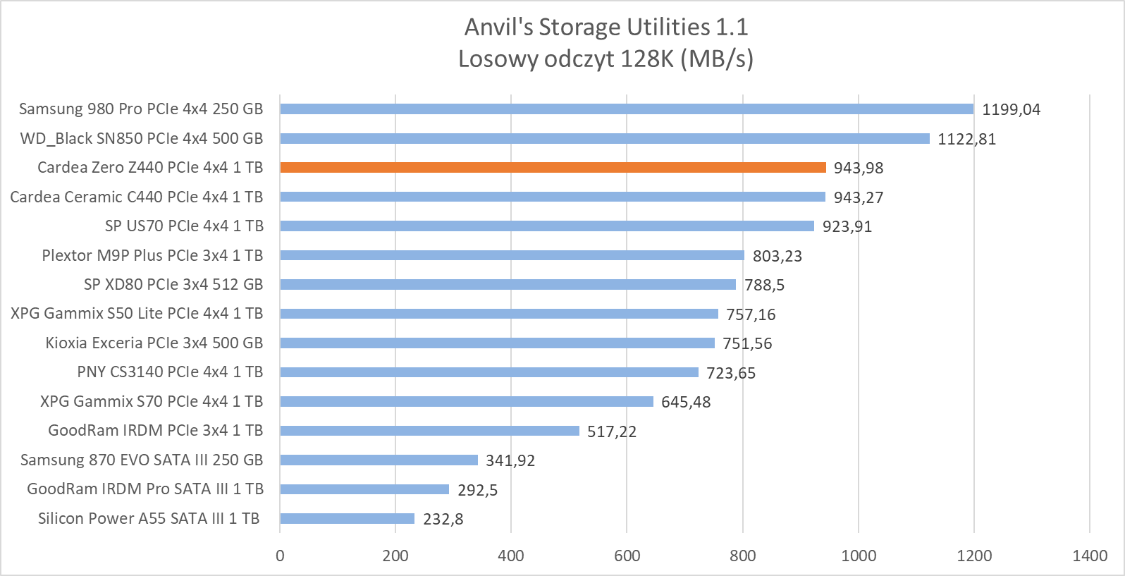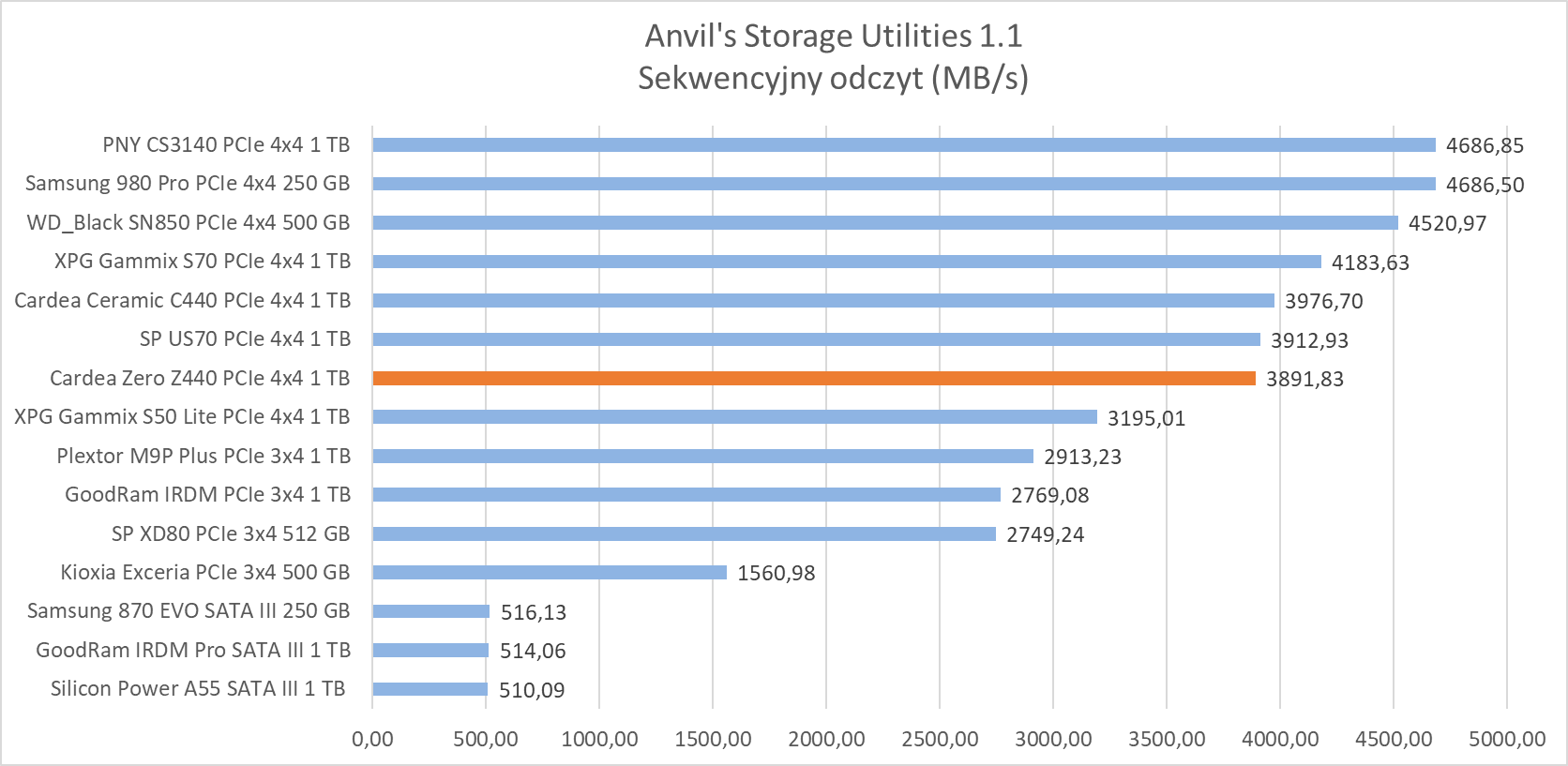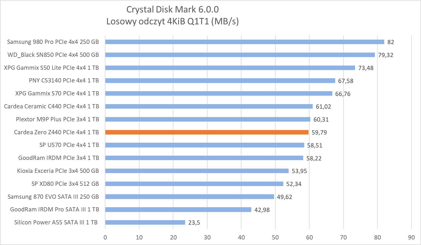 Nasza baza danych obejmuje już sześć dysków w tej konfiguracji (wliczając dziś testowany). Na ich tle Cardea Zero Z440 wypada zadziwiająco dobrze zwłaszcza przy operacjach zapisu. Odczyt wypada z kolei oczekiwanie.