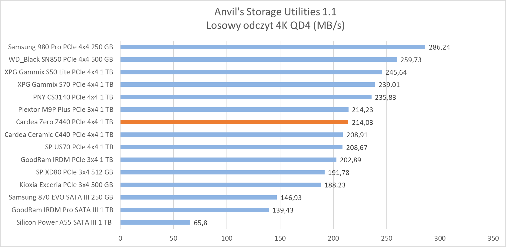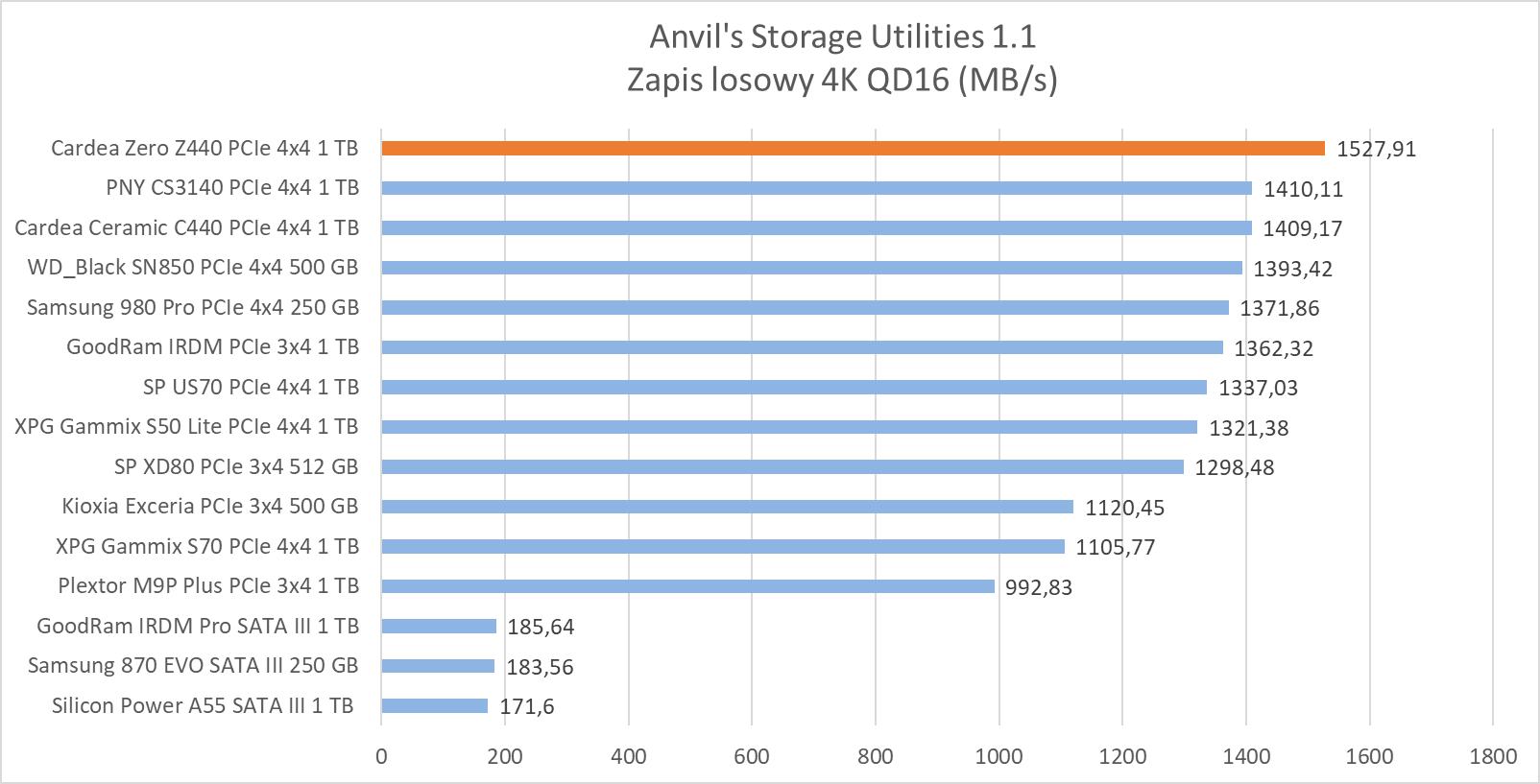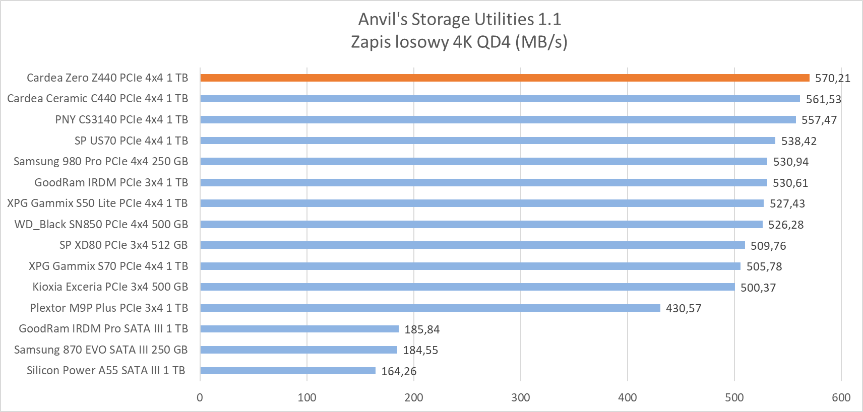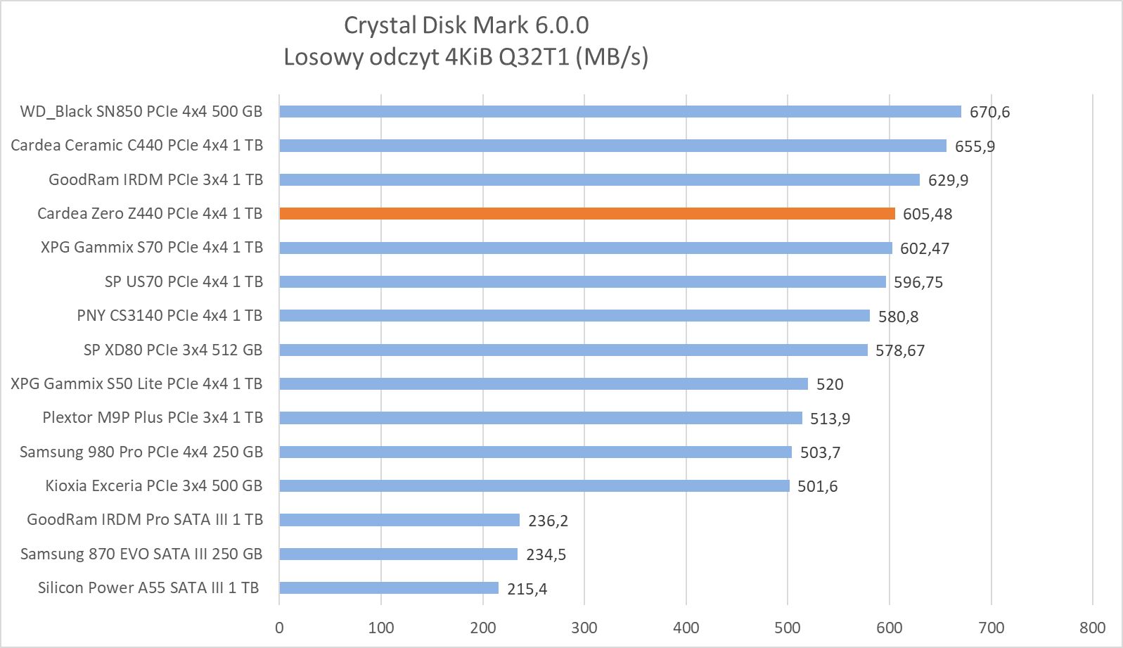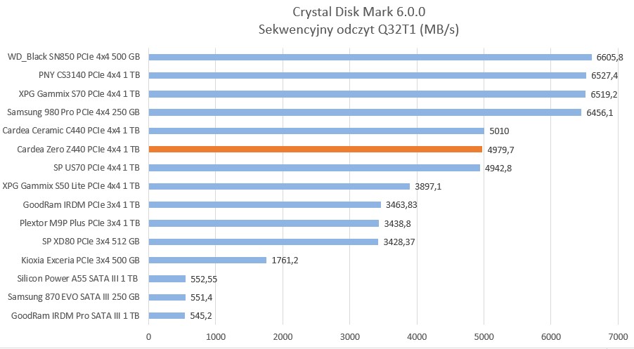 Nasza baza danych obejmuje już sześć dysków w tej konfiguracji (wliczając dziś testowany). Na ich tle Cardea Zero Z440 wypada zadziwiająco dobrze zwłaszcza przy operacjach zapisu. Odczyt wypada z kolei oczekiwanie.