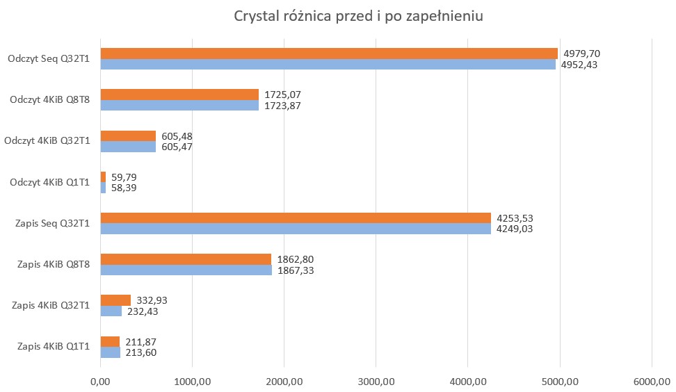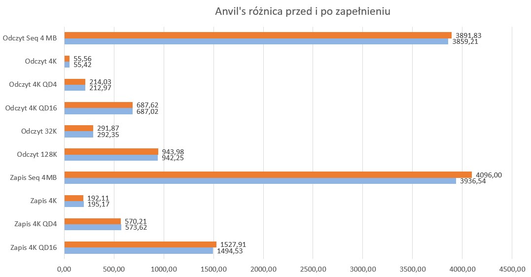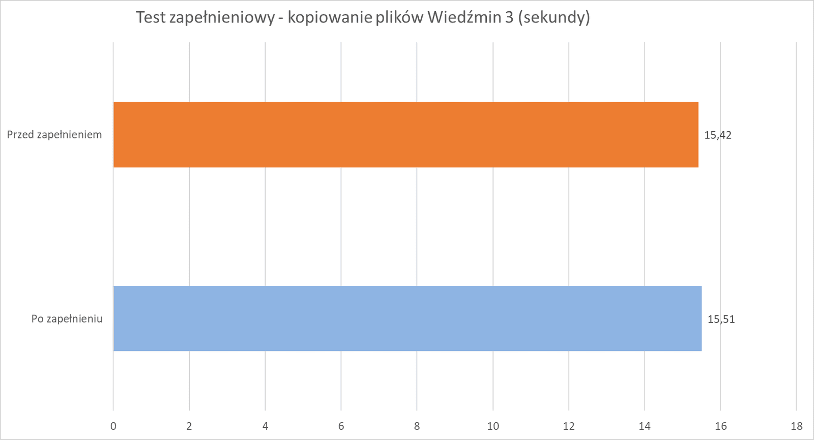 Oprogramowania wykazały marginalne spadki po zapełnieniu, a momentami nawet wyższe odczyty, co jasno wskazuje, że nawet po zapełnieniu dysku do 93% wydajność drastycznie nie spada. Wyniki rzeczywistego kopiowania to potwierdzają