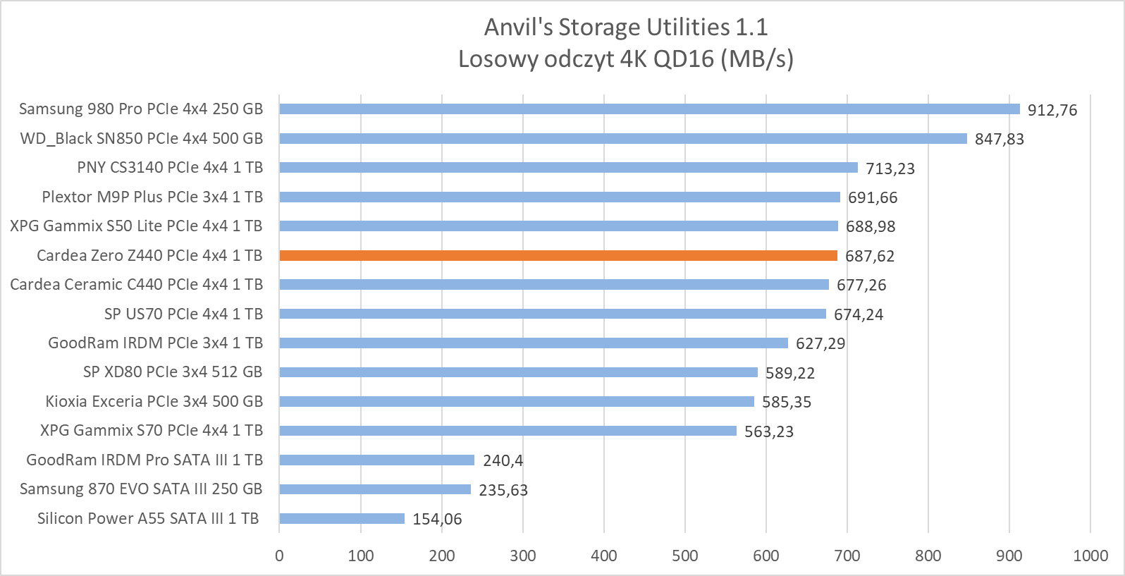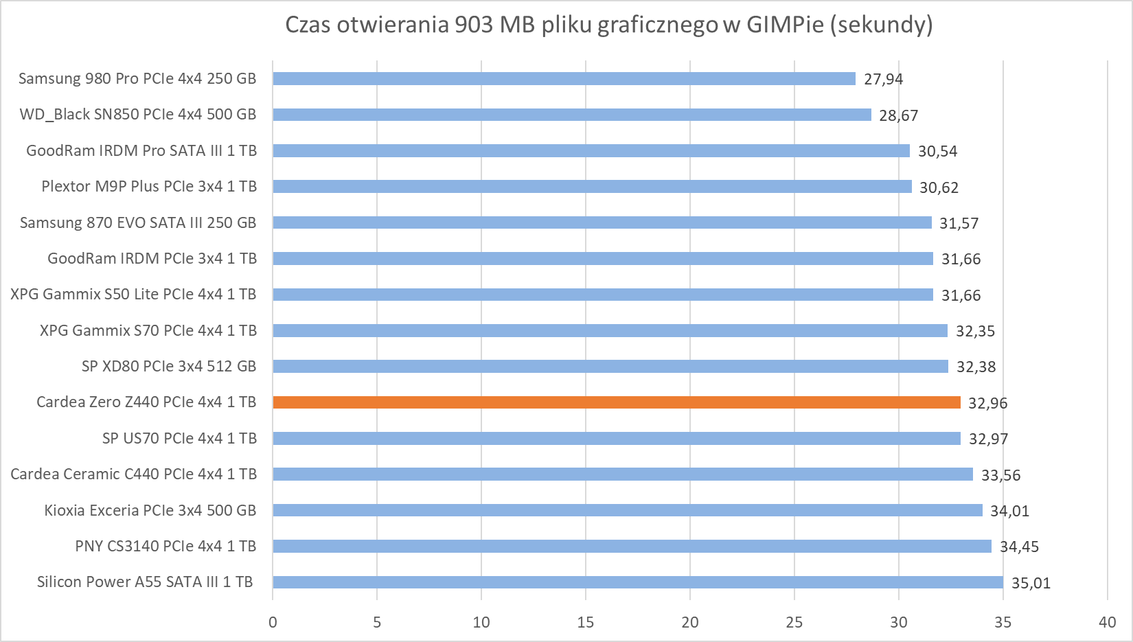 Ich wysokie transfery pozwalają przede wszystkim na jeszcze szybsze transfery plików, a patrząc po liczbie dostępnych dysków o pojemności 1 TB o podobnej do Zero Z440 wydajności “na papierze”, trudno tak naprawdę wskazać najlepszy model w tym segmencie. Rozrósł się on bowiem drastycznie i niestety w wielu przypadkach jest tylko rebrandingiem innych modeli z odmiennymi naklejkami/chłodzeniami, wykorzystując dokładnie te same układy. Te w Cardea Zero Z440 widziałem już nie raz w podobnej lub tej samej nawet konfiguracji.