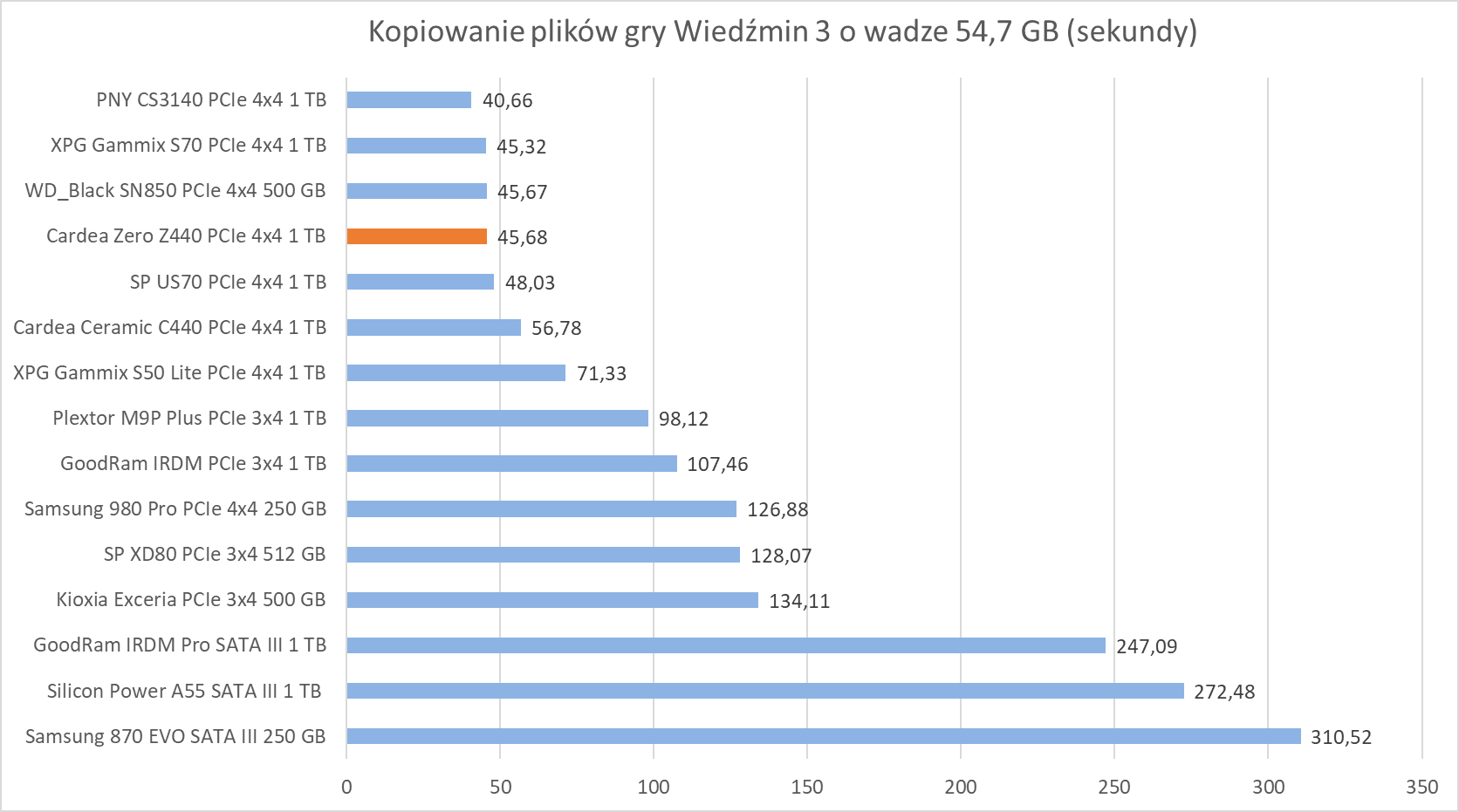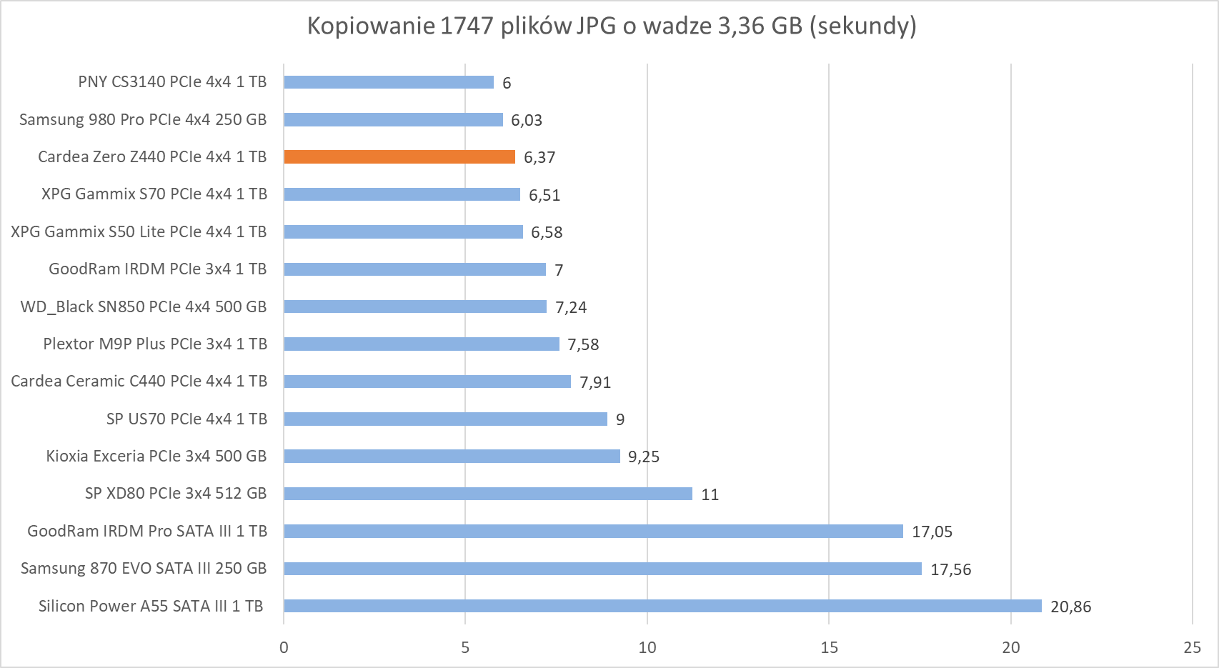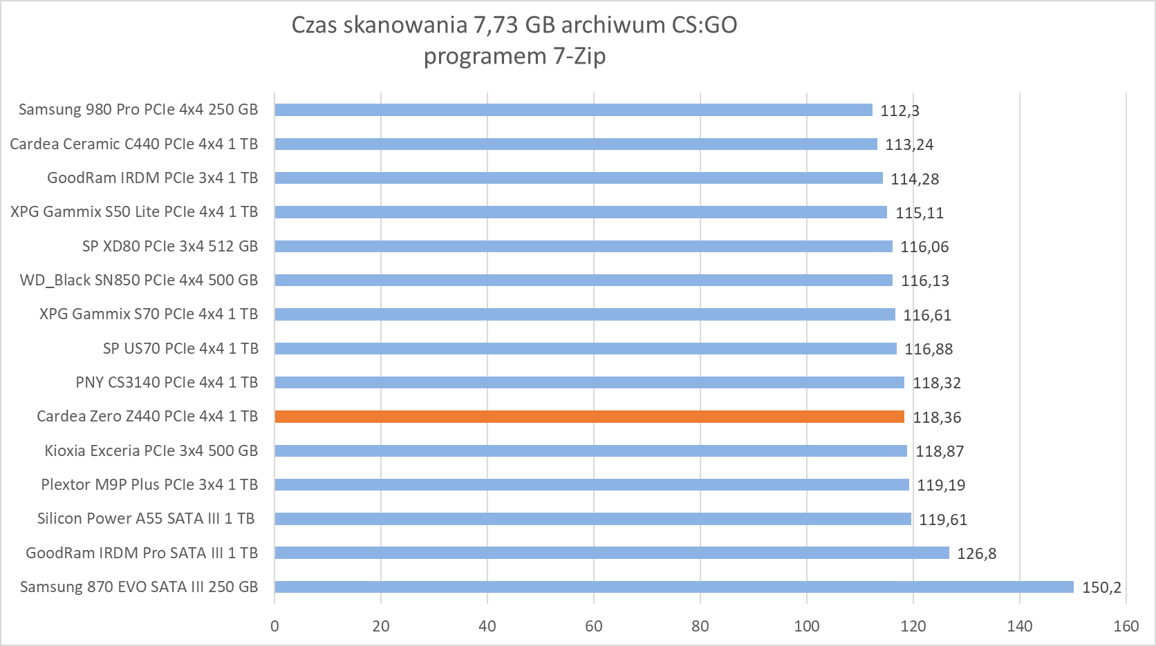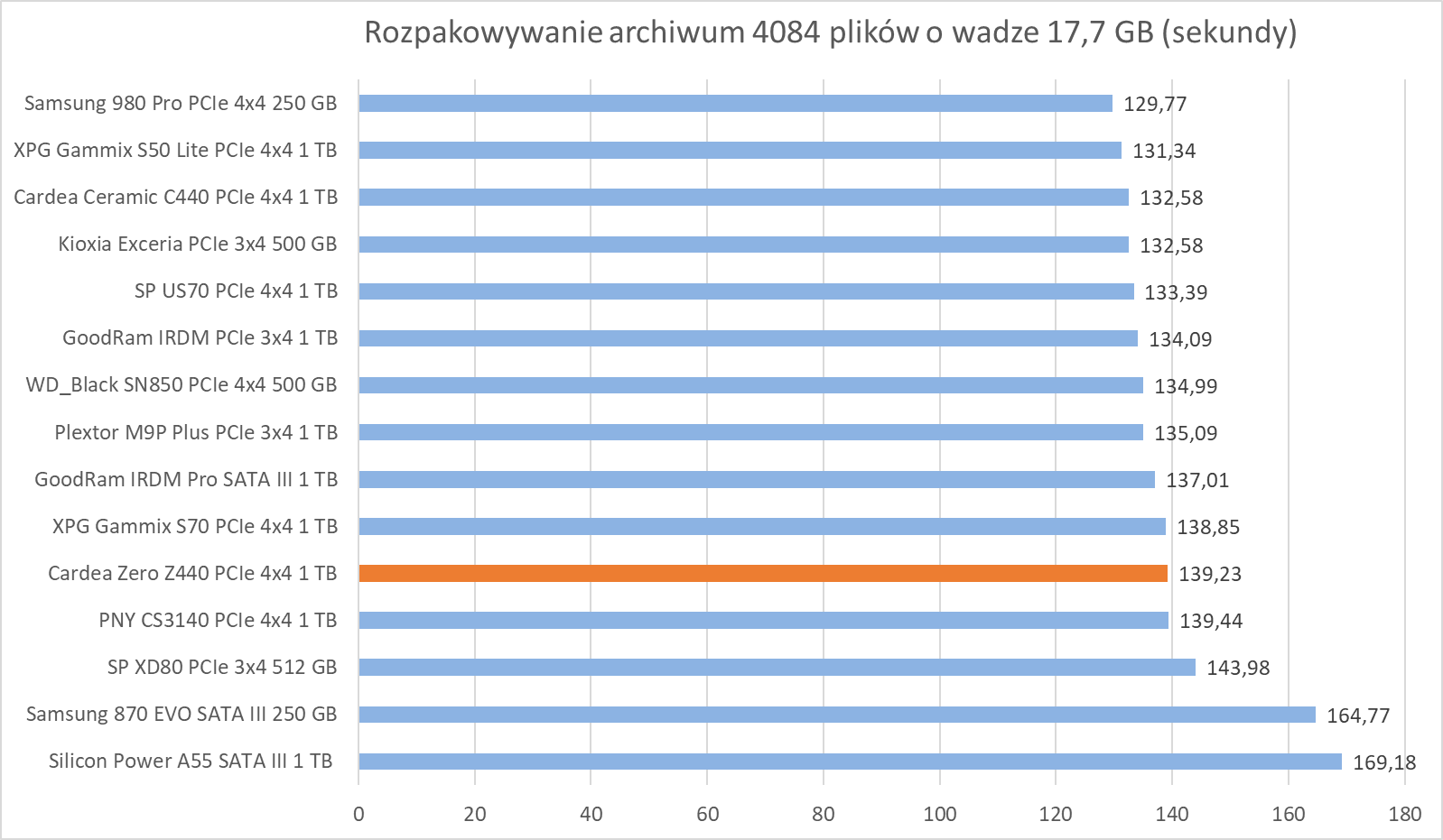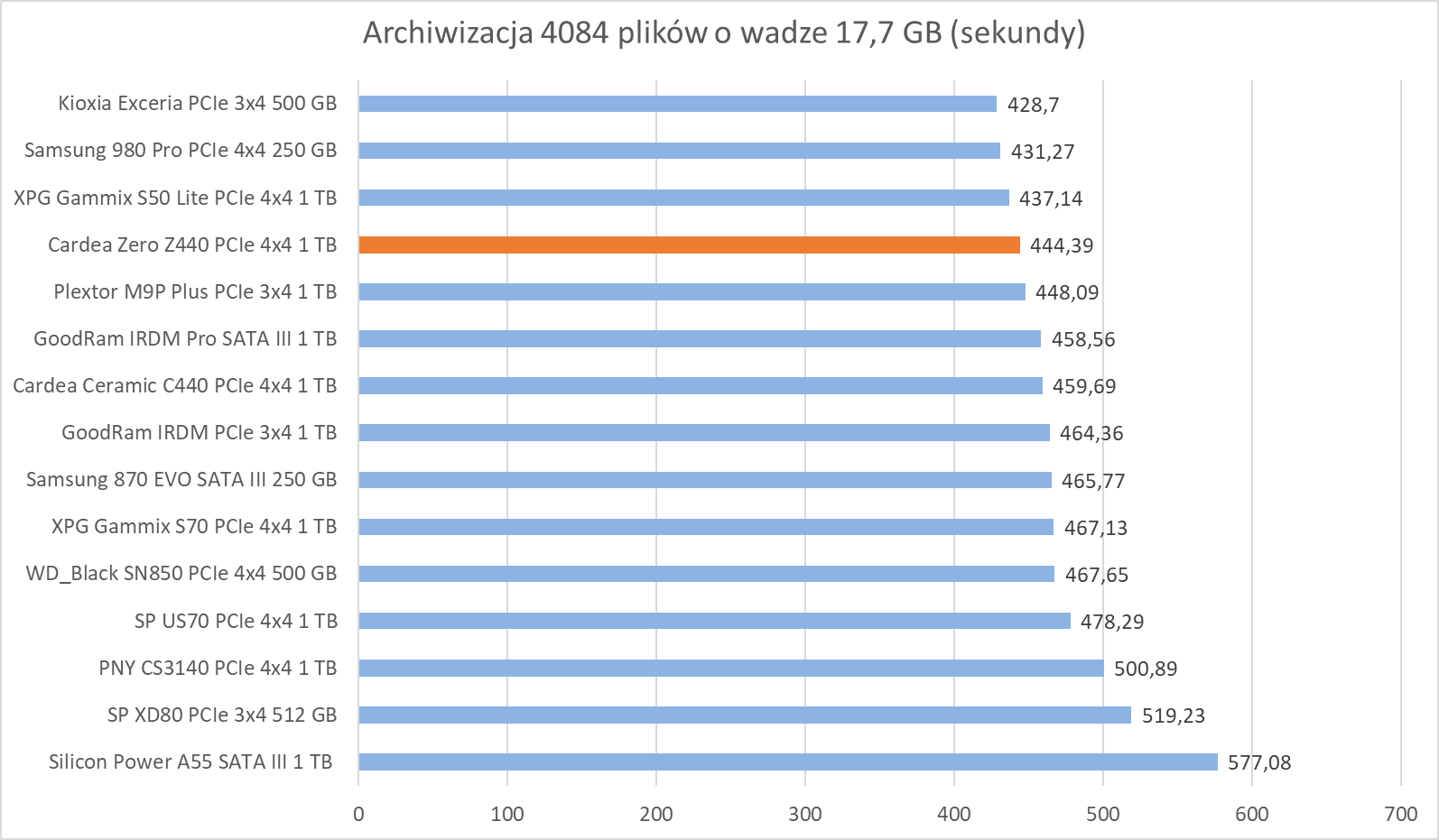 W programach i grach Cardea Zero Z440 łapie jednak czkawkę, zaliczając dobre wyniki wyłącznie przy archiwizacji. Różnice są jednak na tyle niewielkie, że na tle kopiowania ten dysk T-Force wypada świetnie pod kątem ogólnej jakości.