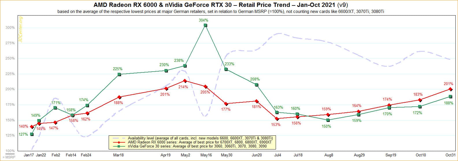 Na przestrzeni 10-31 października ceny wzrosły o 16% w przypadku kart NVIDIA i o 18% w przypadku kart AMD nowej generacji. To sprawiło, że wybrane Radeony RX 6000 są dwa razy droższe niż powinny, a GeForce RTX zbliżają się niebezpiecznie do tego poziomu, choć są całe 13% za konkurencją (101 vs 88%). Najgorsze jest to, że zbliżające się święta tylko pogorszą sprawę.