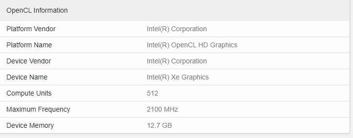 Test wykazał, że uzbrojona w 512 jednostek wykonawczych i 12,7 GB pamięci VRAM (najpewniej nieprawidłowy odczyt) flagowa karta graficzna Intela pracowała z maksymalną częstotliwością 2,1 GHz, którą powinna osiągać. Taki pułap nie dziwi, jako że procesory graficzne Arc Alchemist będą produkowane w oparciu o proces produkcyjny TSMC N6.
