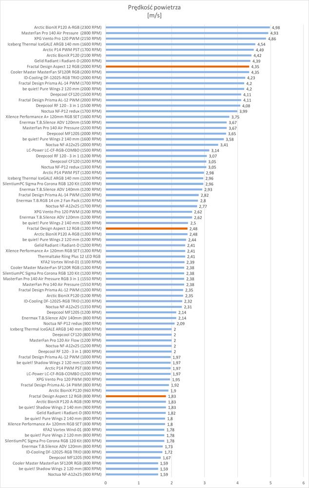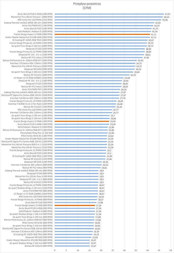 Wydajność jest bardzo dobra. Na wszystkich obrotach wentylatory plasują się w czołówce 120 mm konstrukcji. Tym samym wyprzedają one sporą ilość konkurencji, co z pewnością jest znakomitym wynikiem.