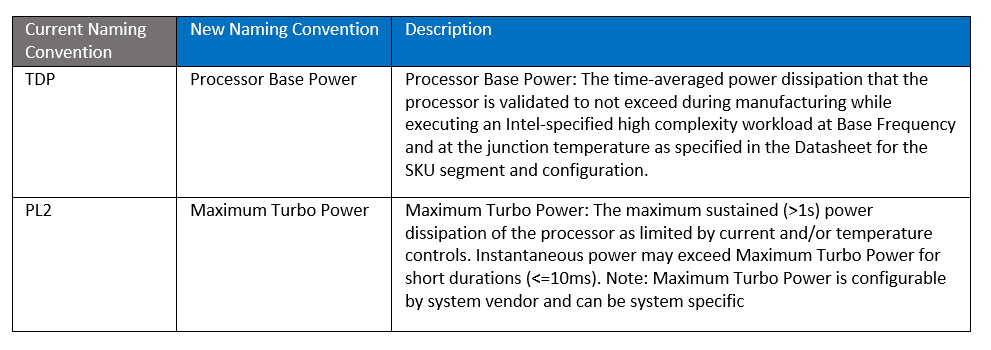 Mowa dokładnie o zastąpieniu określenia TDP/PL1 i PL2 nowymi odpowiednikami – Processor Base Power (PBP – Podstawowa Moc Procesora) oraz Maximum Turbo Power (MTP – Maksymalna Moc Turbo). Na temat obu tych parametrów Intel dokładnie się rozpisał w oficjalnych schematach, ale warto wiedzieć, że Processor Base Power to nadal “Intelowe TDP”, które różni się od “TDP AMD” tym, że procesory regularnie wyznaczony przez niego poziom przekraczają, zwiększając swoje zegary.