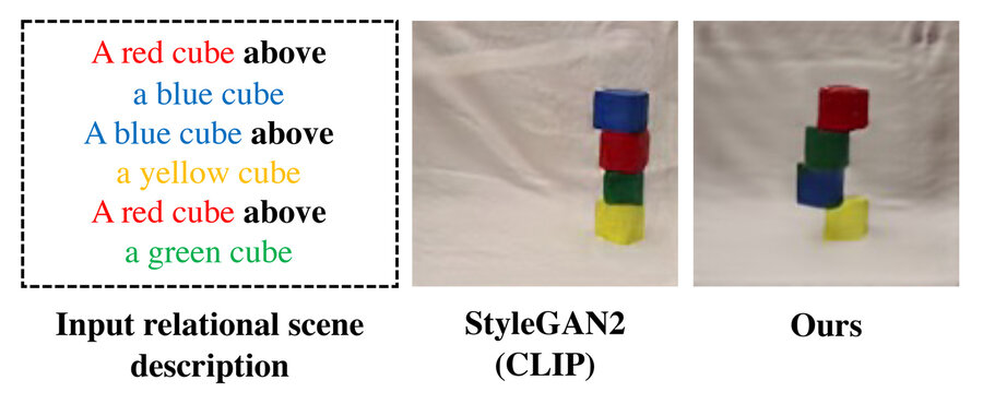 Inne systemy rozpatrują wszystkie relacje całościowo i generują obraz na podstawie opisu. Takie podejście jednak zawodzi, kiedy opisy są nietypowe, na przykład z większą liczbą relacji, ponieważ model ten nie jest w stanie przystosować się do generowania obrazów zawierających więcej relacji. Jako że składamy te oddzielne, mniejsze modele razem, możemy modelować większą liczbę relacji i dostosowywać się do nowych kombinacji. Yilun Du