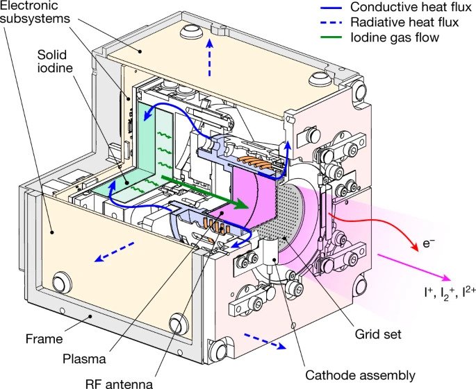 Jod może być przechowywany w formie stałego paliwa wewnątrz statku kosmicznego. Po podgrzaniu go do umiarkowanej temperatury, jod przechodzi – z pominięciem fazy ciekłej – do postaci gazu. Ten jest następnie traktowany elektronami o dużej prędkości, dzięki czemu gaz zmienia się w plazmę złożoną z jonów jodu i wolnych elektronów. Kiedy plazma jest wyrzucana z układu wydechowego statku, ten zaczyna się poruszać.