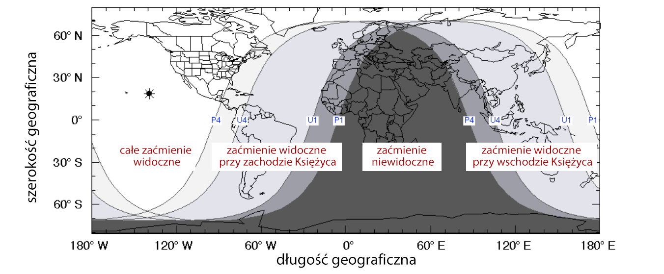 Niestety, dla polskich fanów astronomii, szczególnie tych z południa i wschodu naszego kraju, nie mamy najlepszych wiadomości. O ile przebywając na zachodzie, północy i w centrum będziemy w stanie dostrzec zaćmienie w czasie zachodu Księżyca, tak na pozostałych obszarach zjawisko będzie niewidoczne.