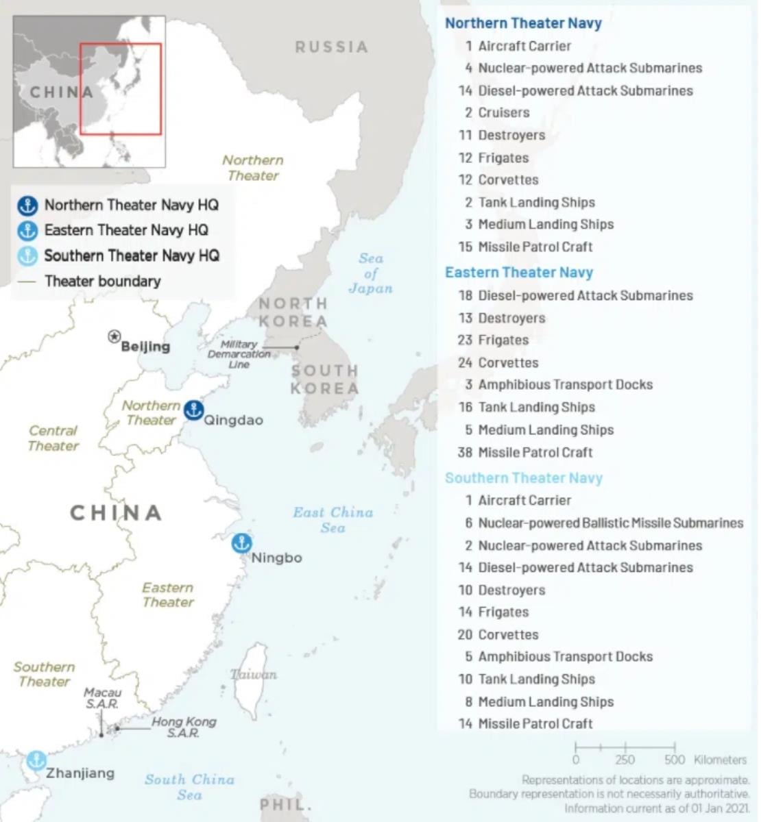 Wspomniane 355 okrętów PLAN dotyczy “głównych statków bojowych nawodnych, okrętów podwodnych, lotniskowców, okrętów wojennych, okrętów desantowych i jednostek pomocniczych dla floty”. Na te przydzielone do głównych flot PLAN składają się m.in.: