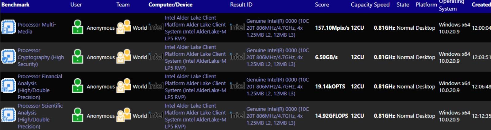 Wspomniany wyżej diagram jasno wskazuje, że rodzina Ultra Mobile w postaci Alder Lake-M, może połączyć w sobie maksymalnie dwa rdzenie Performance i dwa klastry “po 4” rdzeni Efficiency. W takim właśnie układzie wystąpił pierwszy, ewidentnie flagowy przykład tej rodziny, który doczekał się testu w SiSoftware Sandra. Wystąpił tam pod kodem Genuine Intel(R) 0000 (10C 20T 806MHz/4.7GHz, 4x 1.25MB L2, 12MB L3), podając nam na tacy najważniejsze szczegóły specyfikacji.