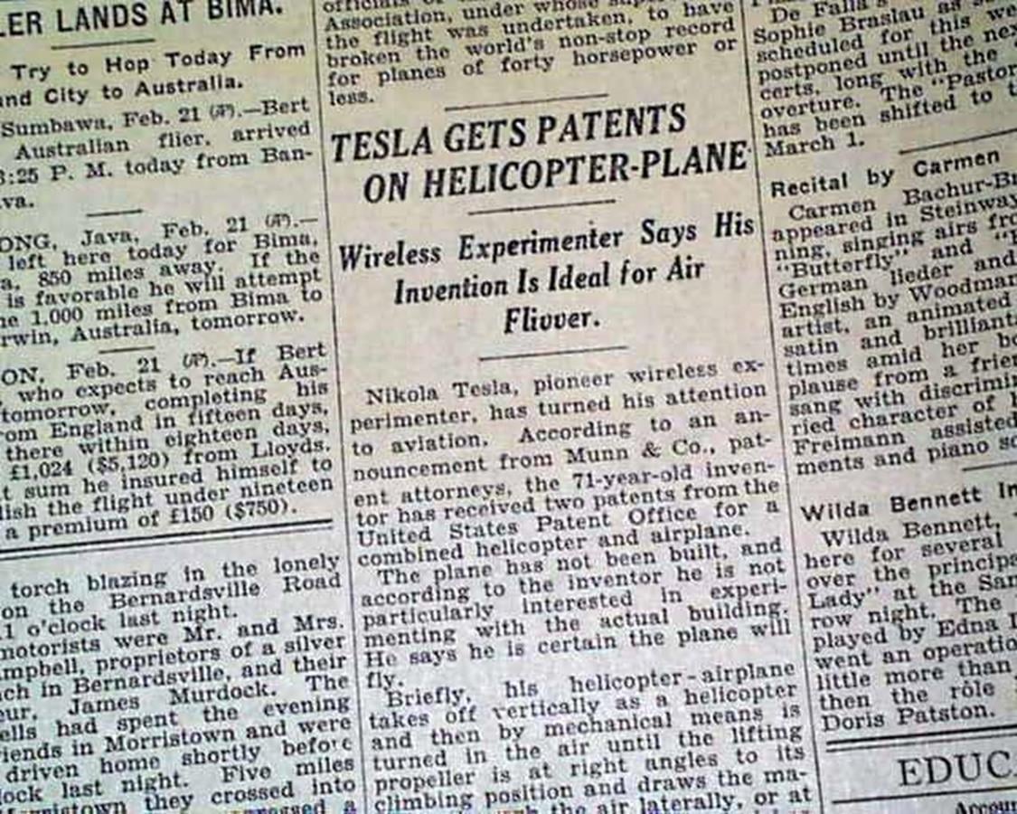 W 1928 roku Nikola Tesla ogłosił dumnie, że wynalazł nowy typ samolotu, który określał mianem „śmigłowca-samolotu”, o czym poinformowała gazeta The New York Times. Najważniejsza cecha? Oczywiście startowanie i lądowanie w pionie, które umożliwia operowanie tak naprawdę z każdego zakątka naszej planety. Opatentowanego pionowzlotu Tesli jednak nigdy nie skonstruowano… i dobrze.