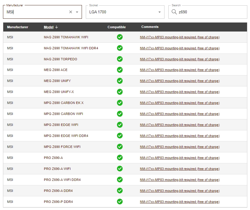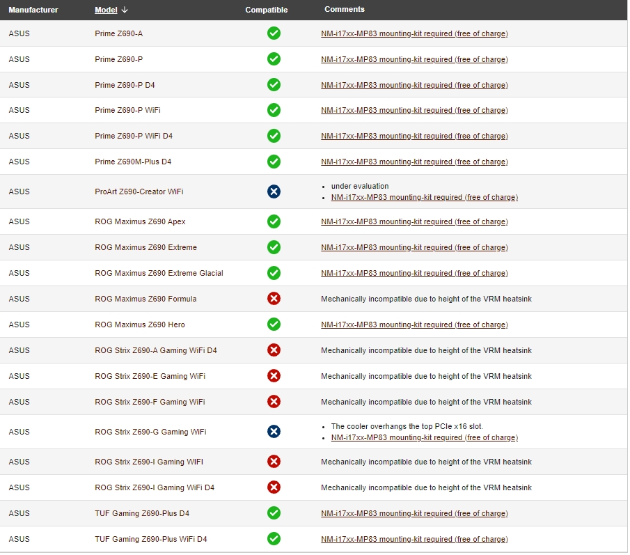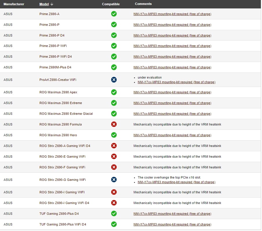 Powyżej możecie rzucić okiem na kwestię kompatybilności płyt Z690 ASUSa z NH-D15S i porównać ją stanu płyt od MSI. Różnica jest ogromna, ale z drugiej strony ASUS jest wyjątkiem na rynku i zapewnił swoim płytom głównym Z690 nie tylko luki montażowe z myślą o nowych zestawach na LGA1700, ale też tych starszych na LGA1200. Oznacza to tyle, że z tymi płytami nie potrzebujecie w ogóle wymieniać chłodzenia, jeśli akurat przeskakujecie np. z 10. lub 11. generacji Intel Core.