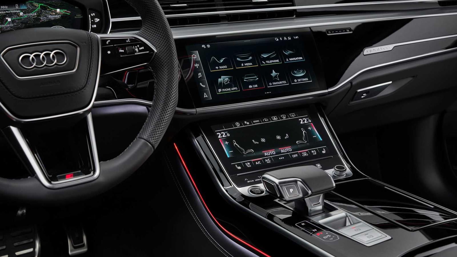 Przechodząc dalej, Audi A8 2022 w kabinie nie zaszalało, ale nic w tym dziwnego, jako że od całych czterech lat ten model oferuje najbardziej zaawansowaną technologię firmy. Dlatego też Audi postawiło na delikatne zmiany, dorzucając do najnowszej wersji Audi Virtual Cockpit opcjonalny wyświetlacz head-up. Tradycyjnie konsola środkowa posiada dwa ekrany dotykowe o przekątnej 10,1 cala i 8,6 cala, a pasażerowie na tyle mogą cieszyć oko 10,1-calowymy wyświetlaczami na oparciu foteli.