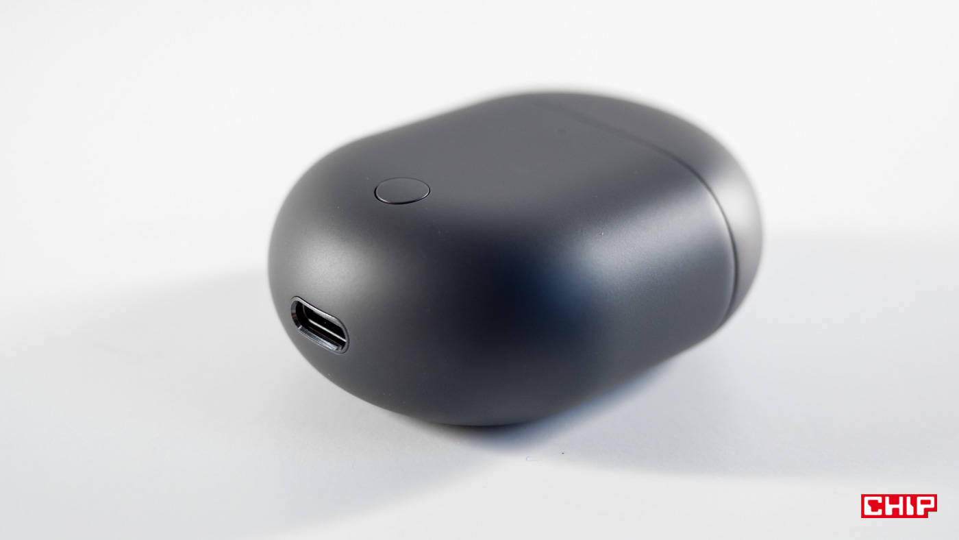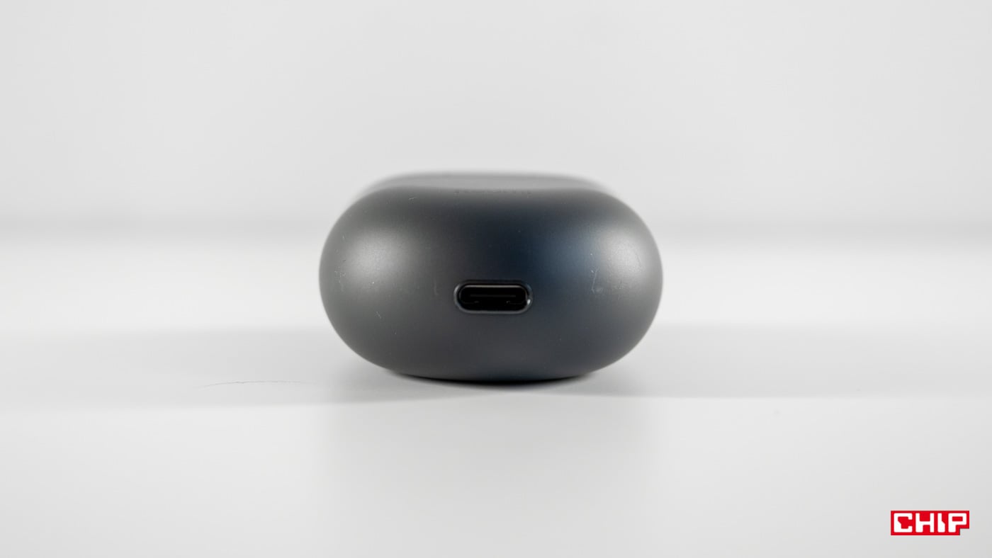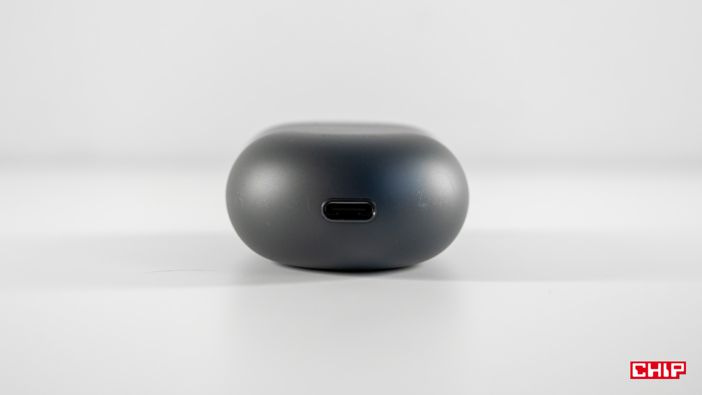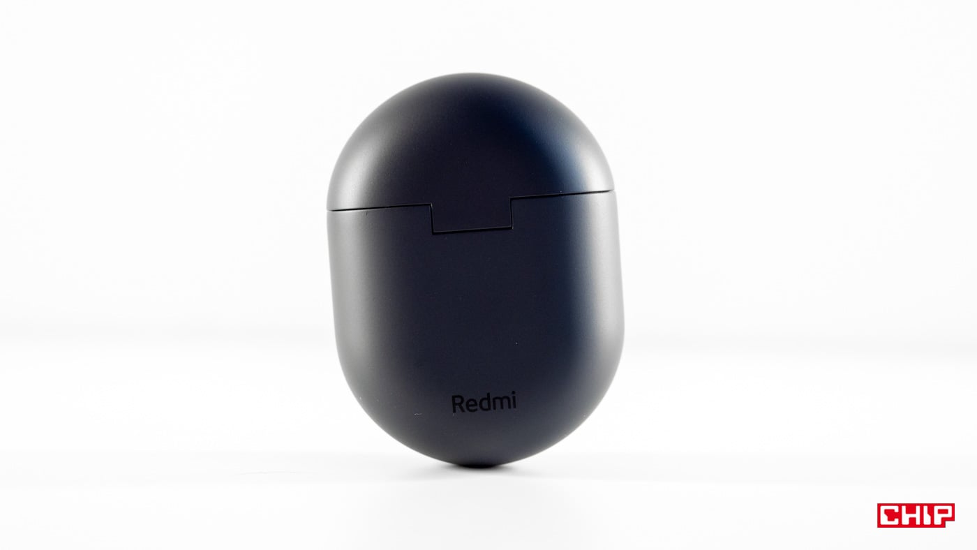 Jak już wspominałem, pierwszy rzut oka na słuchawki sugeruje coś ze znacznie wyższej półki i jest to spowodowane zdecydowanie samym etui o wielkości 65 x 48 x 26 mm. Jako “owalna szkatułka” z matowego, bardzo przyjemnego dla oka i dłoni tworzywa sztucznego, etui Buds 3 Pro, przypomina spłaszczone na bokach jajko o regularnych, obłych liniach. W wersji grafitowej sprawia świetne, eleganckie i zdecydowanie minimalistyczne wrażenie, bo jedynym wizualnym dodatkiem jest skromny, ciemniejszy napis “Redmi” na tyle. Poza tym posiada tradycyjny zestaw elementów, czyli port USB-C na spodzie, diodę i przycisk funkcyjny na froncie i wieńczącą całość klapkę na zawiasie.