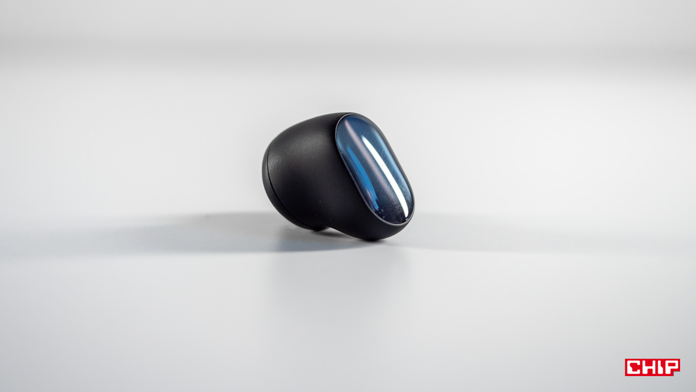 Jako dokanałowe wkładki pozbawione “łodyżki”, Redmi Buds 3 Pro przyjmują z zewnątrz kształt podobny do samego etui. Im bliżej gumki, tym jajowaty kształt zwieńczony śliskim panelem dotykowym z dziurką na mikrofon zmienia się na bardziej cylindryczny i wyprofilowany (specjalnie z myślą o małżowinie) aż do wysuniętego na samą krawędź “elementu” z silikonową gumką. Dzięki swojej konstrukcji te leciutkie słuchawki (4,9 gramów każda) bardzo głęboko osadzają się w małżowinach. Producent umieścił na nich trzy mikrofony (łącznie sześć), piny ładujące, które pełnią też funkcję czujnika obecności słuchawek w uszach i najpewniej ukrytą pod mała siateczką na górnej części słuchawek dziurkę do wyrównywania ciśnienia. Spokojnie jednak – Buds 3 Pro są odporne na wodę w ramach tradycyjnej dla większości słuchawek TWS klasie IPX4.