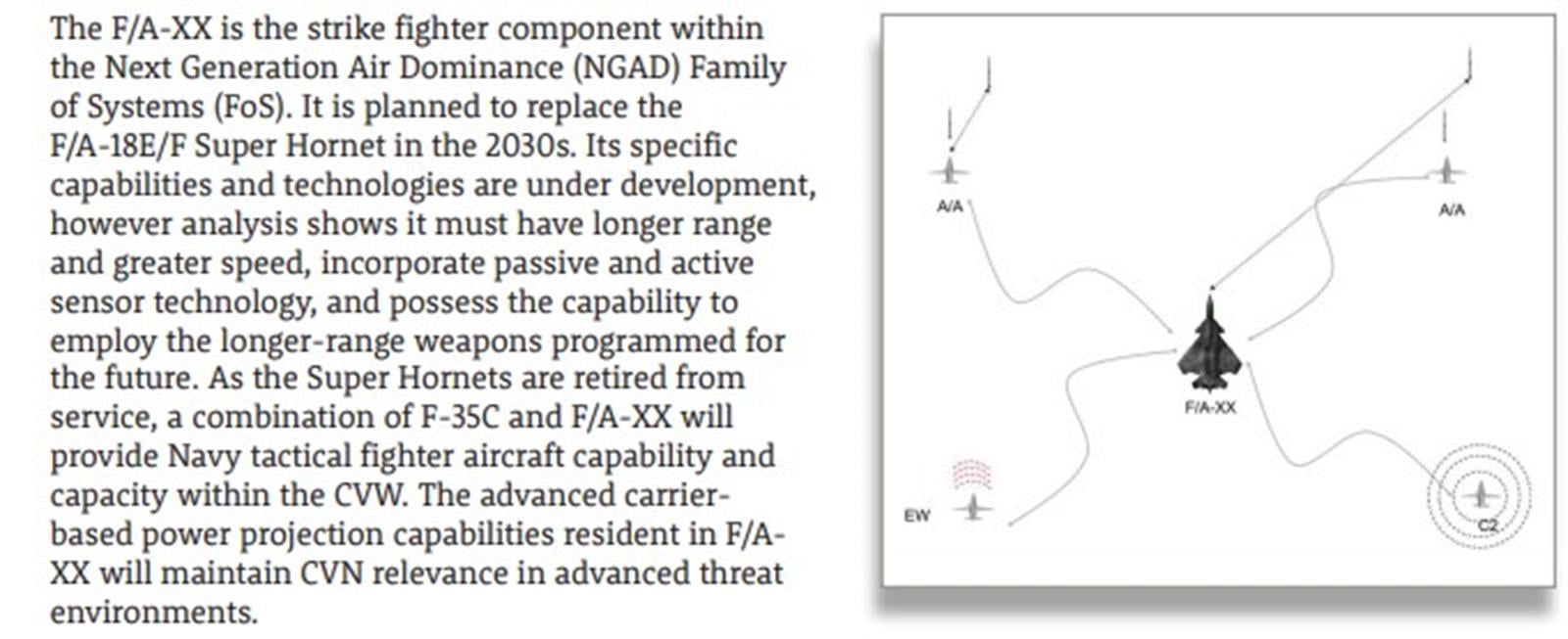 F/A-XX jest myśliwcem uderzeniowym [powstającym] w ramach rodziny systemów (FoS) dominacji powietrznej nowej generacji (NGAD). Planowana jest wymiana F/A-18E/F Super Hornet w latach 30. XX wieku. Jego specyficzne możliwości i technologie są w trakcie opracowywania, jednak analiza pokazuje, że musi mieć większy zasięg i większą prędkość, zawierać pasywną i aktywną technologię czujników oraz posiadać zdolność do stosowania broni o większym zasięgu zaprogramowaną na przyszłość.