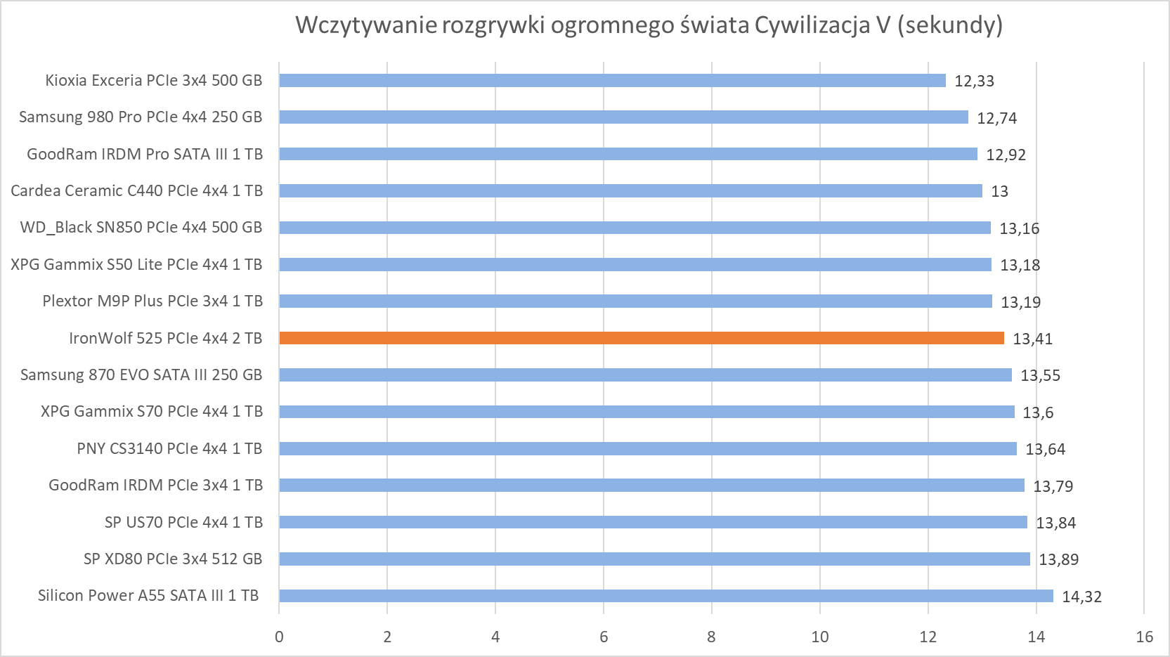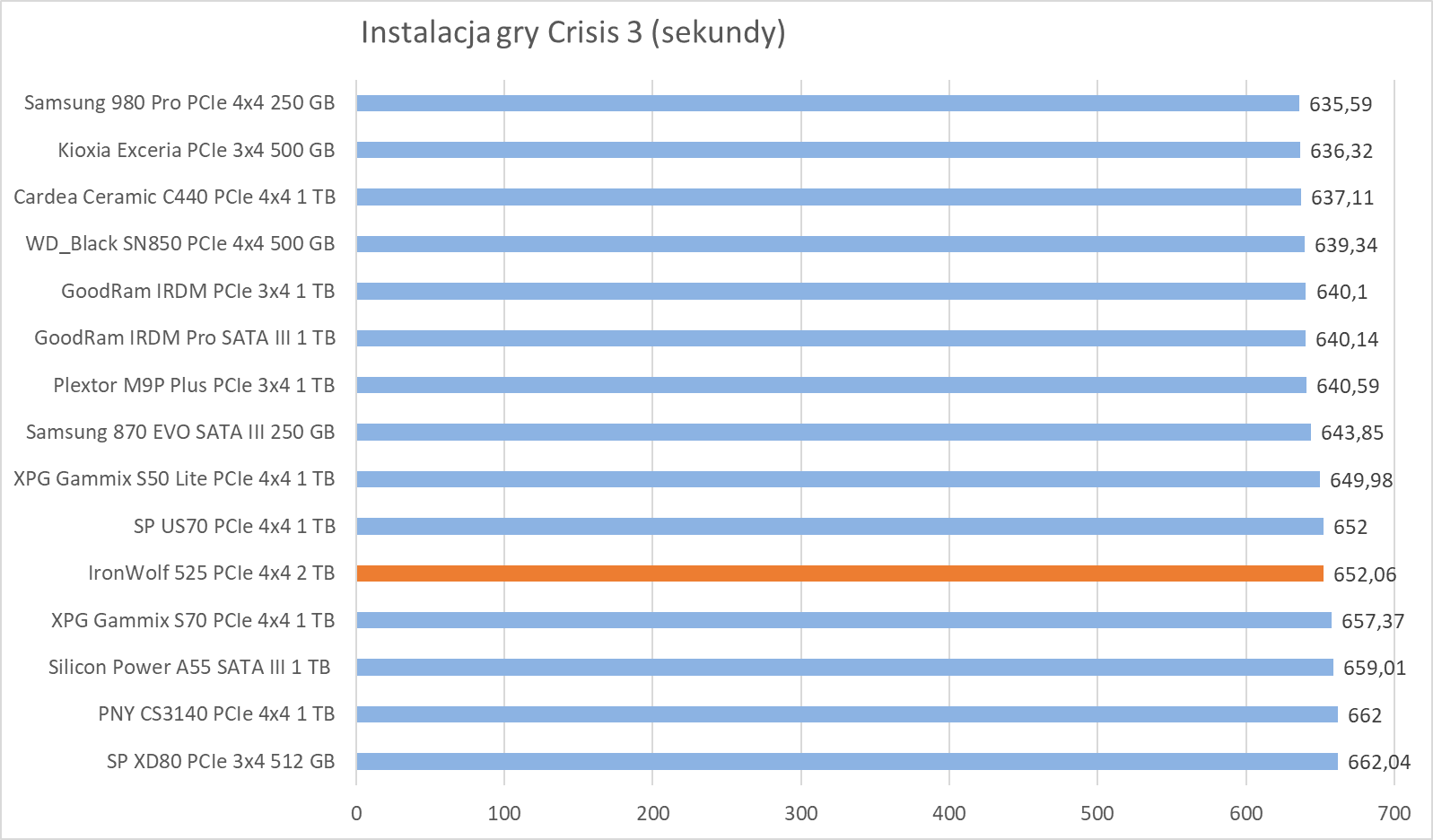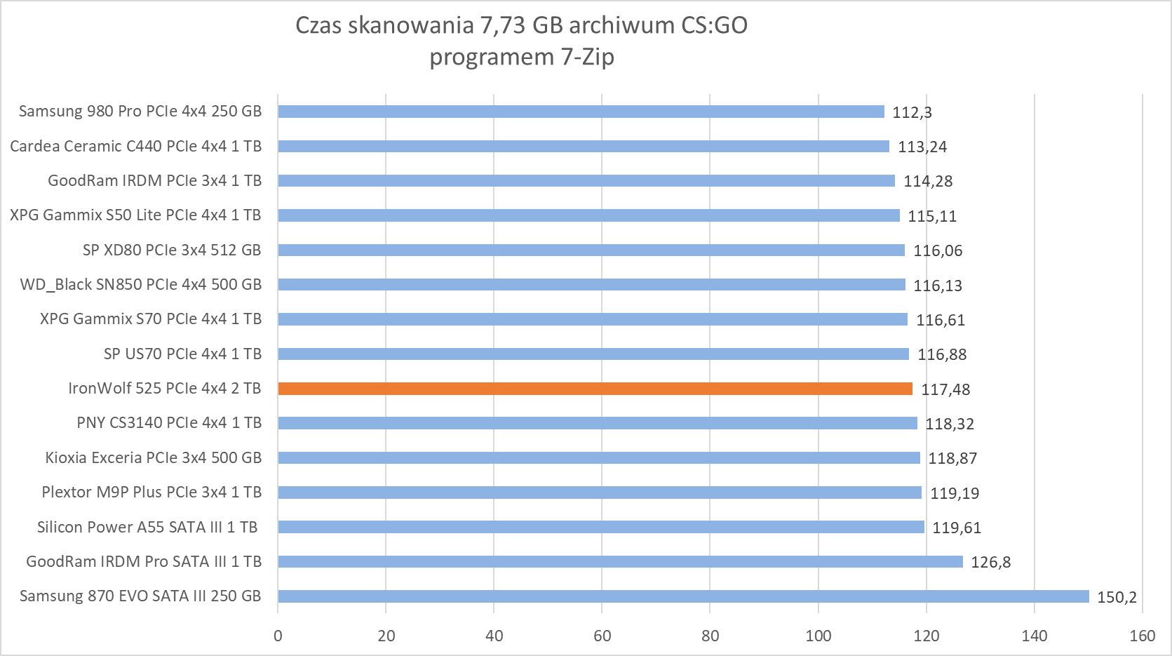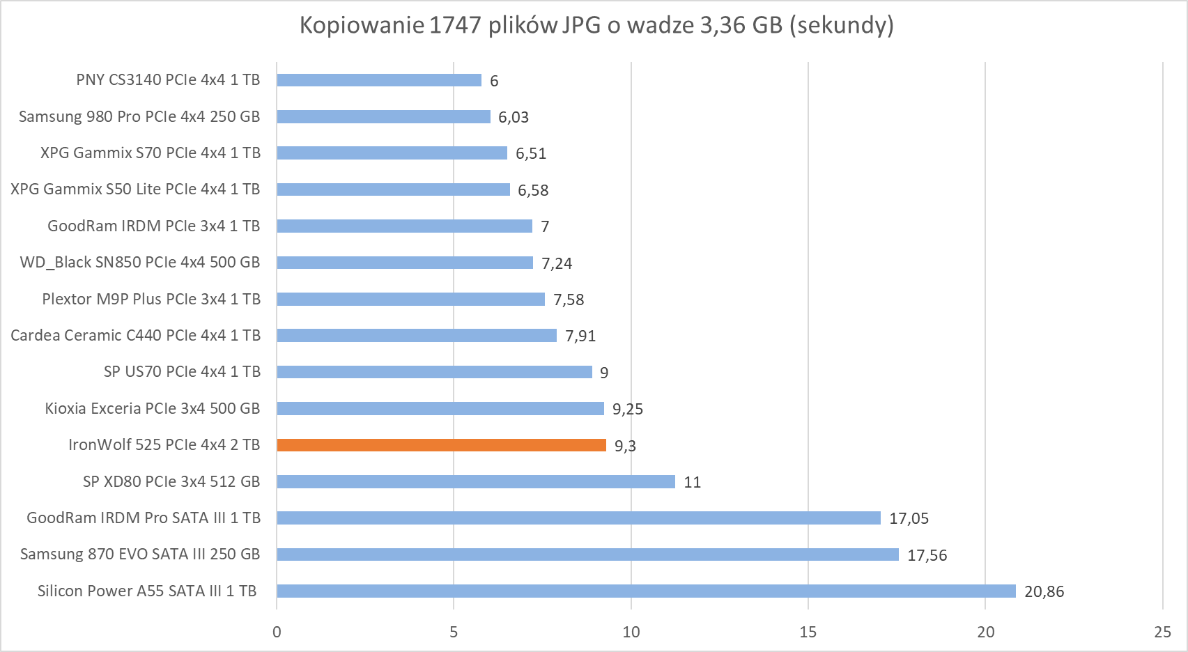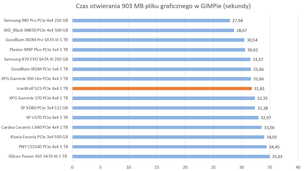 W programach i grach Seagate IronWolf 525 2 TB na PCIe 4.0×4 wypada już gorzej z momentem przebłysku w kwestii archiwizacji plików.