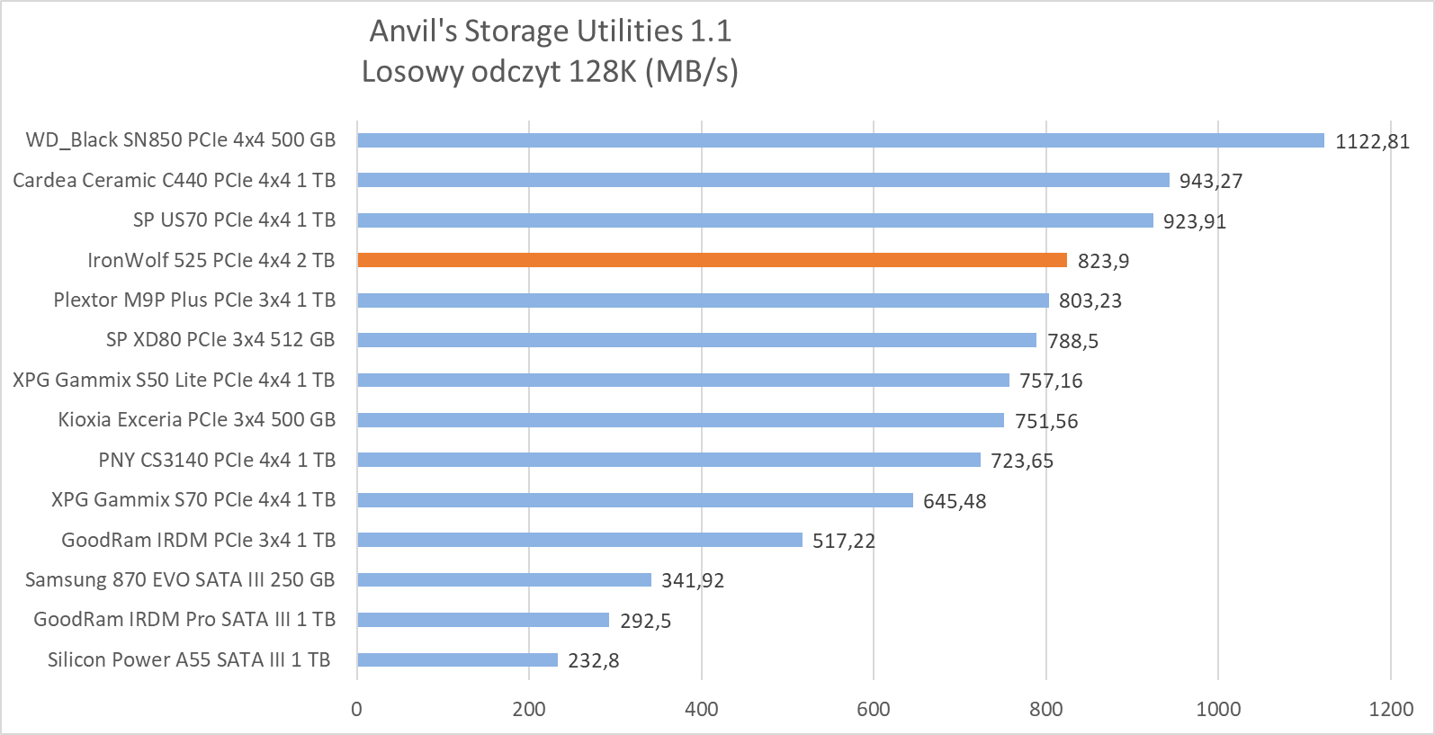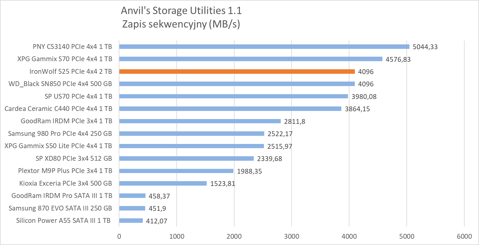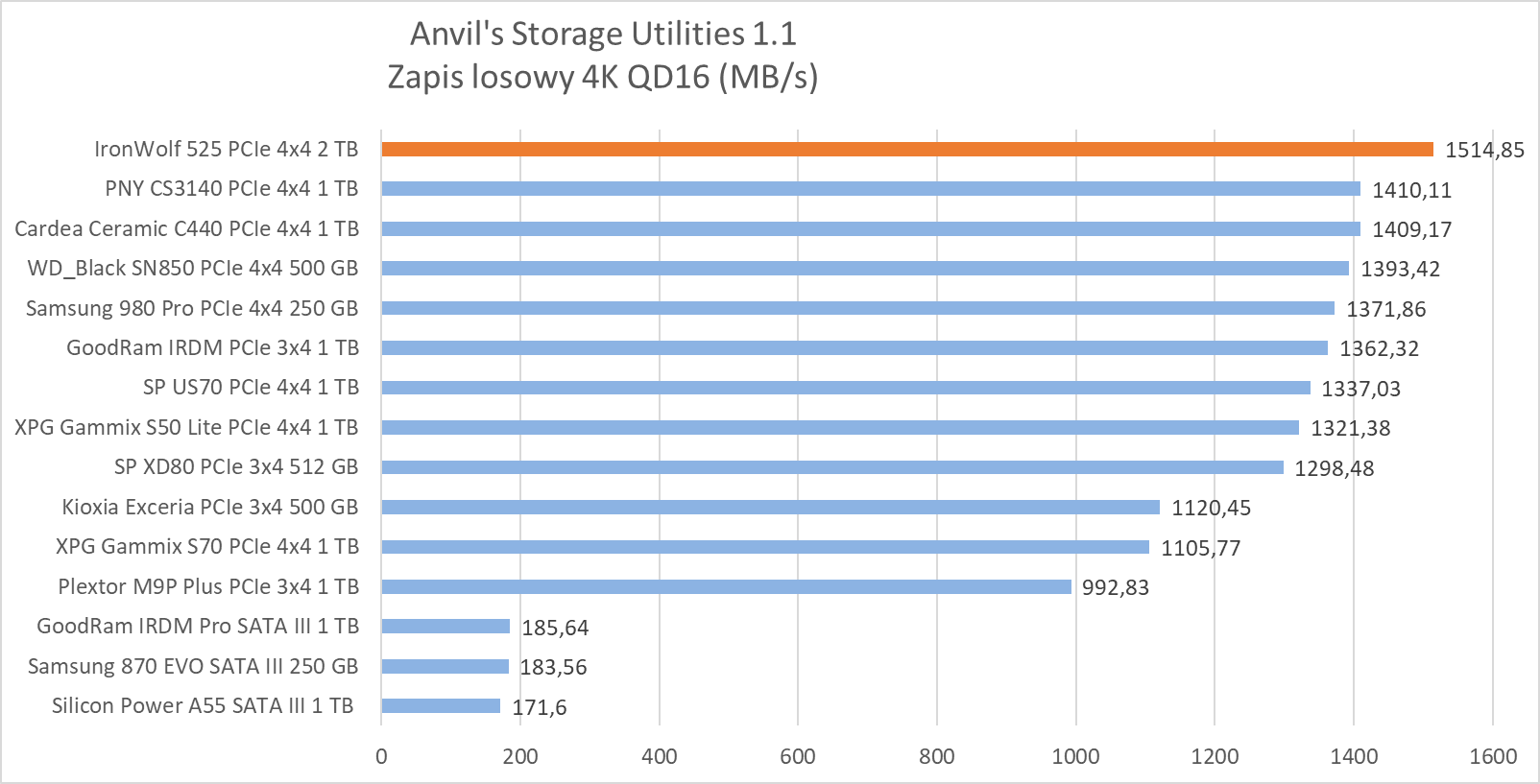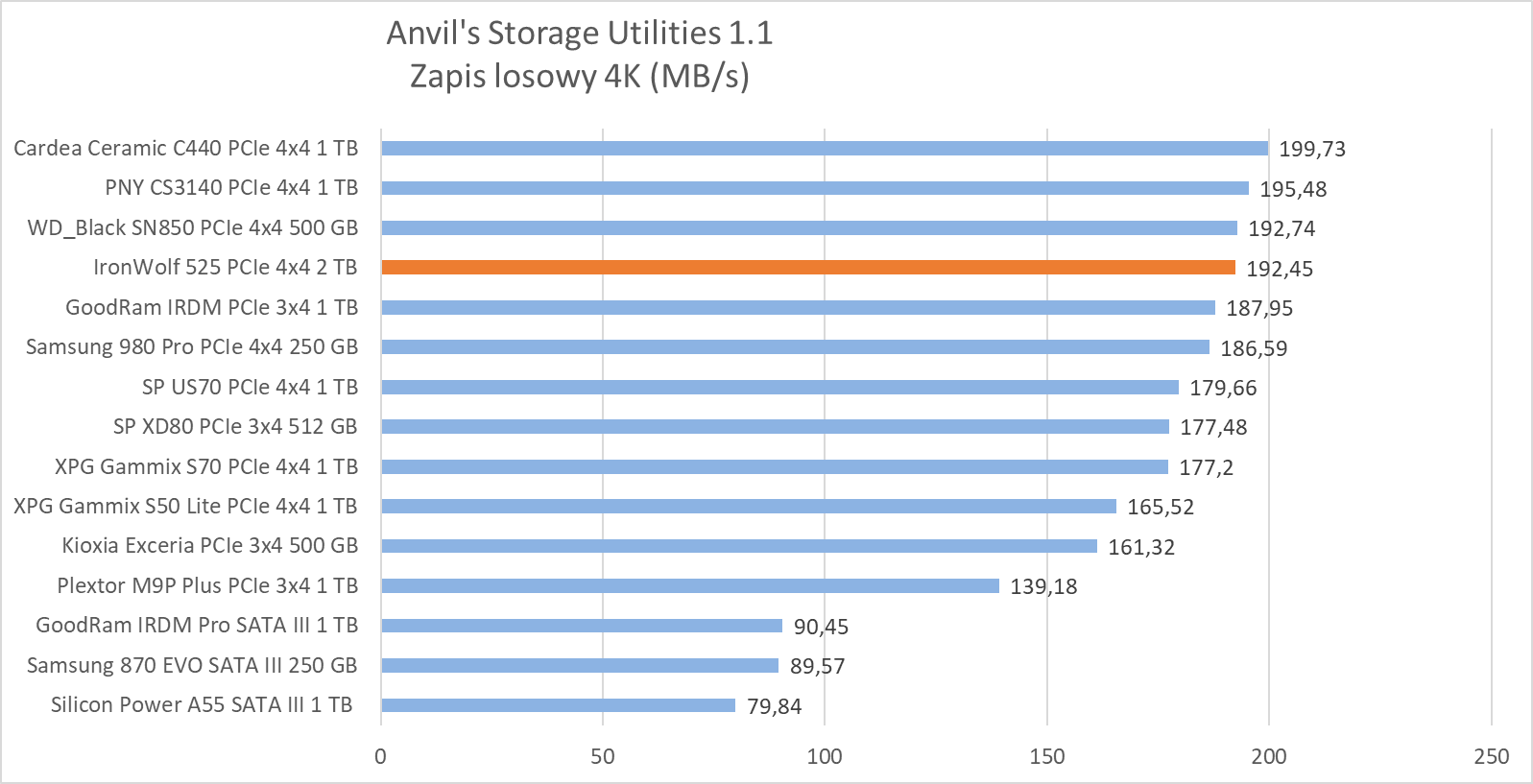W testach syntetycznych wykazał wydajność na oczekiwanym poziomie, plasując się w czołówce najwydajniejszych dysków, ewidentnie “lubiąc” się z testem Anvil’s Storage Utilities 1.1, gdzie jego wydajność w zapisie dwóch próbek rozgromiła całą konkurencję