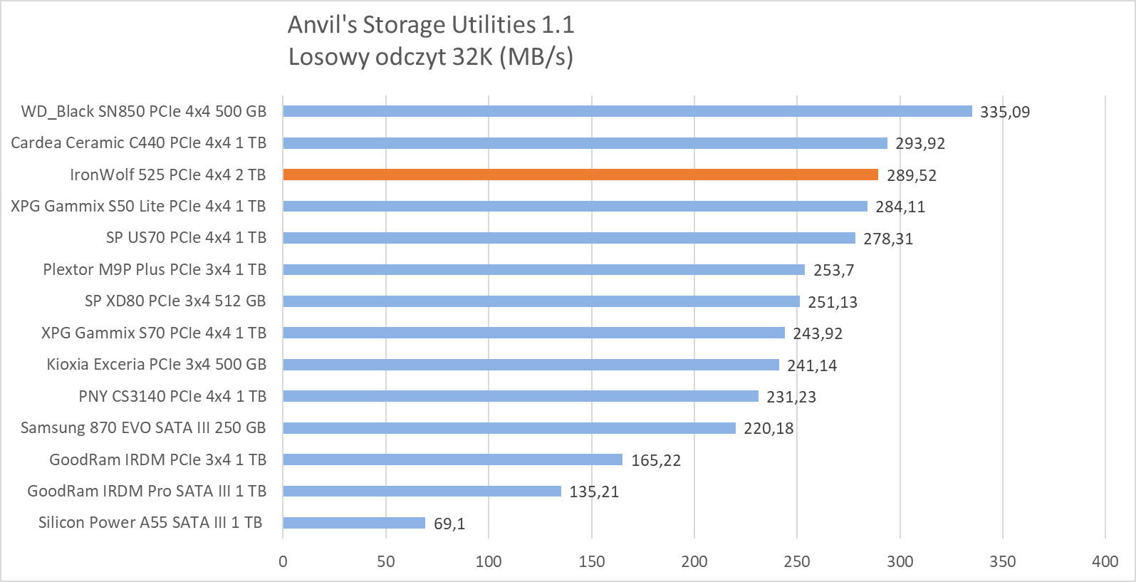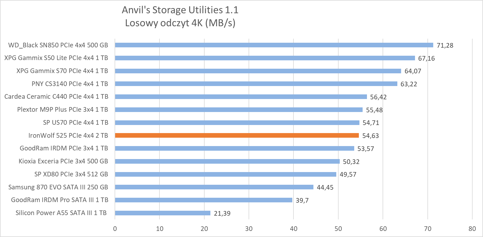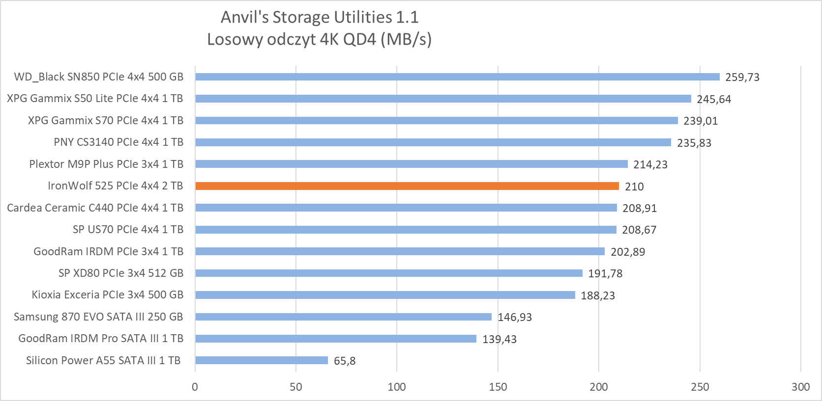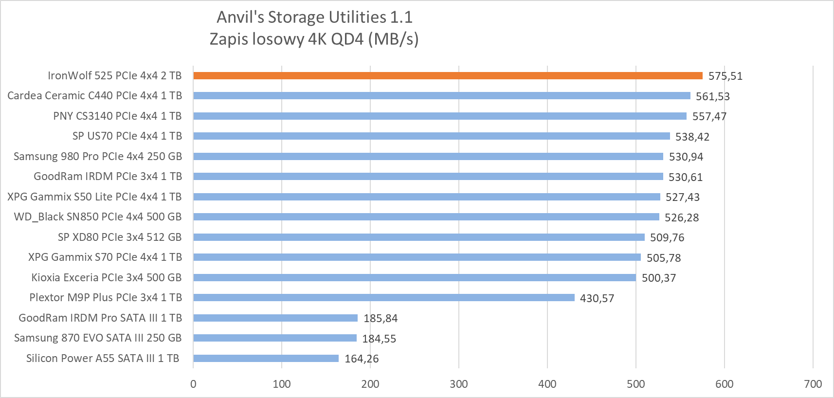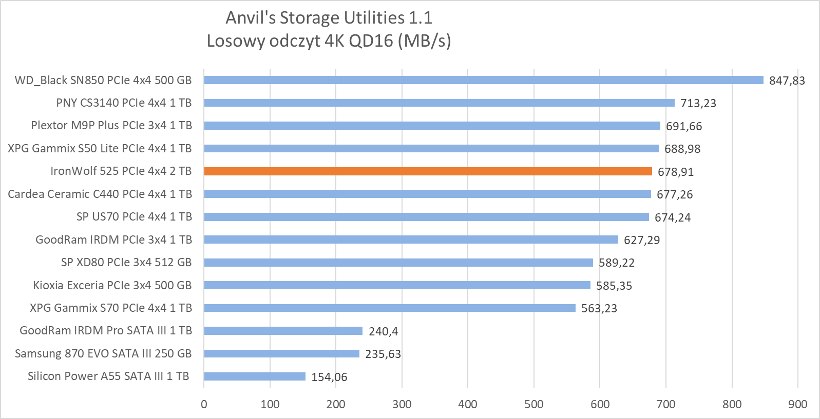 W testach syntetycznych wykazał wydajność na oczekiwanym poziomie, plasując się w czołówce najwydajniejszych dysków, ewidentnie “lubiąc” się z testem Anvil’s Storage Utilities 1.1, gdzie jego wydajność w zapisie dwóch próbek rozgromiła całą konkurencję