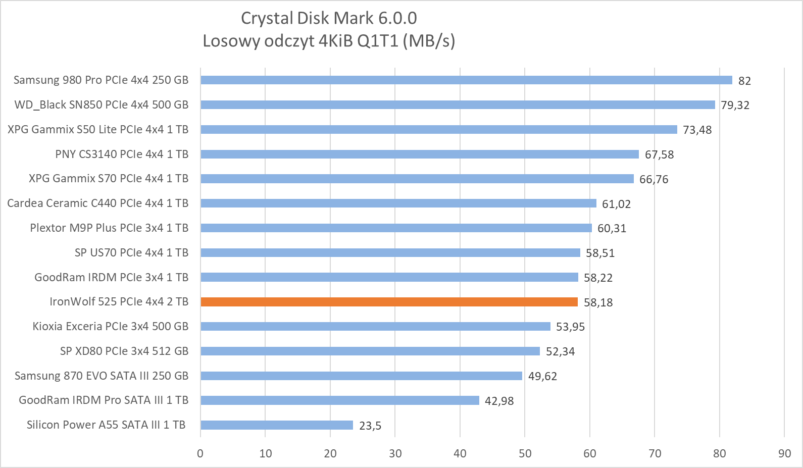W praktyce ten 2-TB wariant IronWolf 525 oferuje 1810 GB pojemności i prędkości odczytu i zapisu sekwencyjnego na poziomie odpowiednio 5000/4400 MB/s. Wydajność losowa opiewa z kolei na 740000 IOPS, jeśli idzie o odczyt losowy próbek 4 KB QD32 i 700000, jeśli idzie o zapis tych samych próbek.