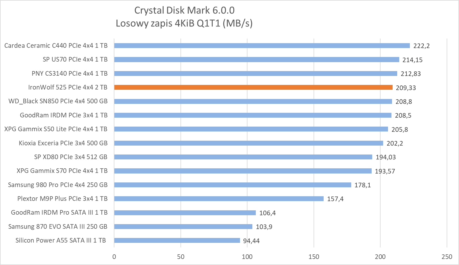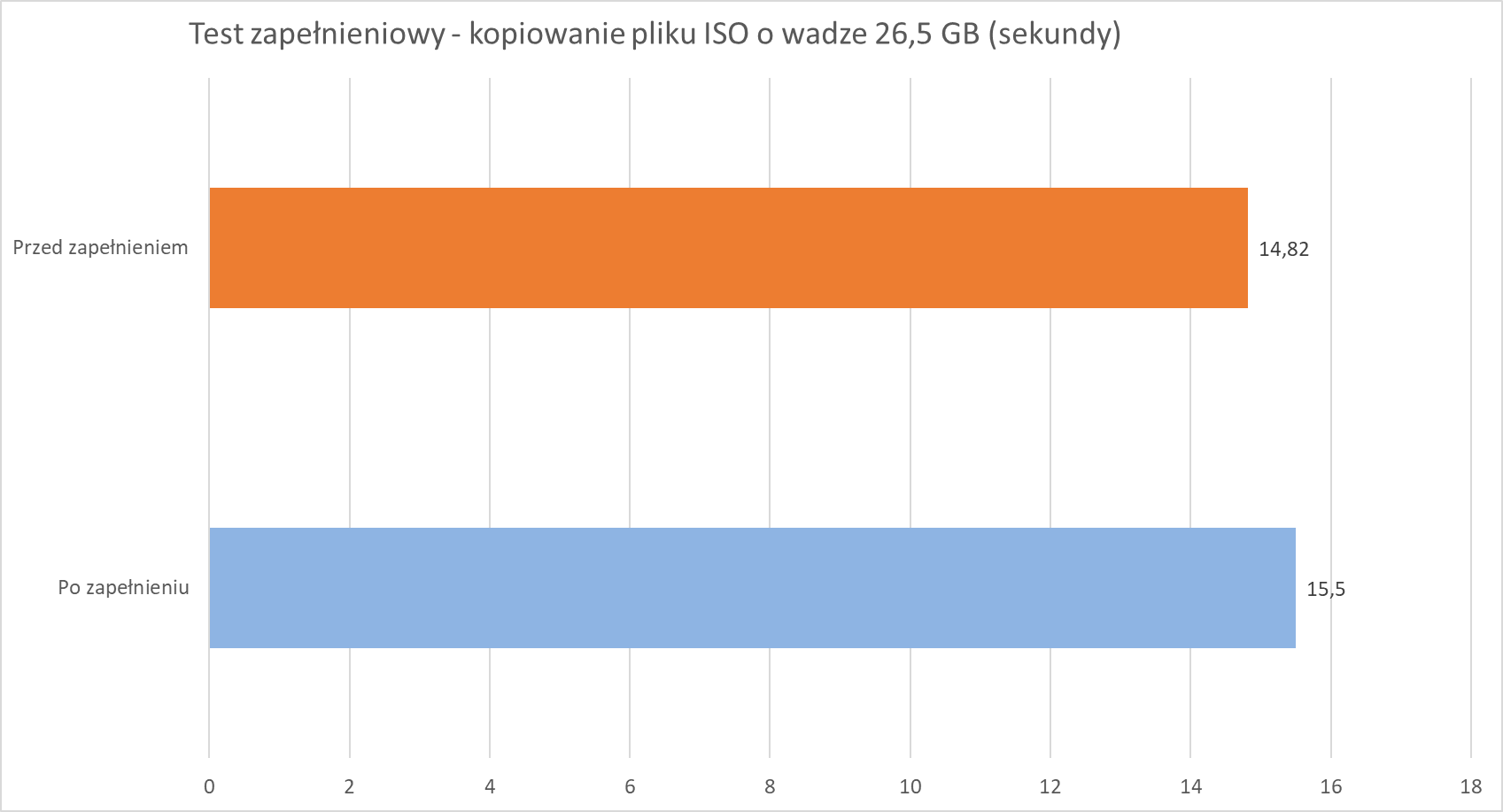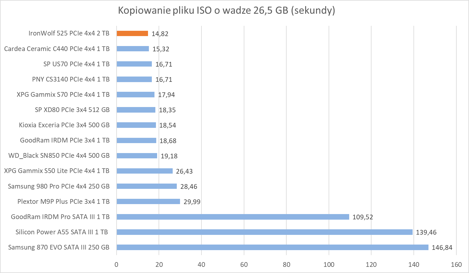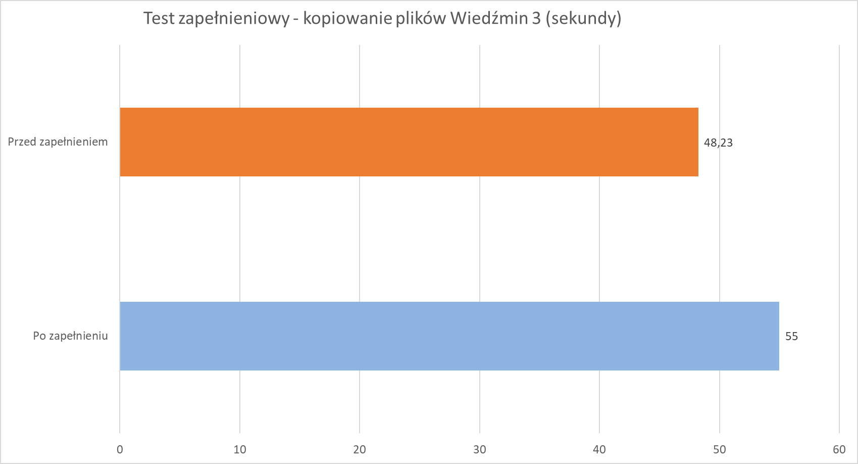 Nie bez powodu zresztą znalazł się na szczycie wykresu w kopiowaniu tegoż pliku, radząc sobie gorzej z licznymi mniejszymi plikami oraz ich usuwaniem, co świetnie podkreśla wynik kopiowania Wiedźmina 3, będący wręcz idealnym przykładem “uśrednienia” tych możliwości.