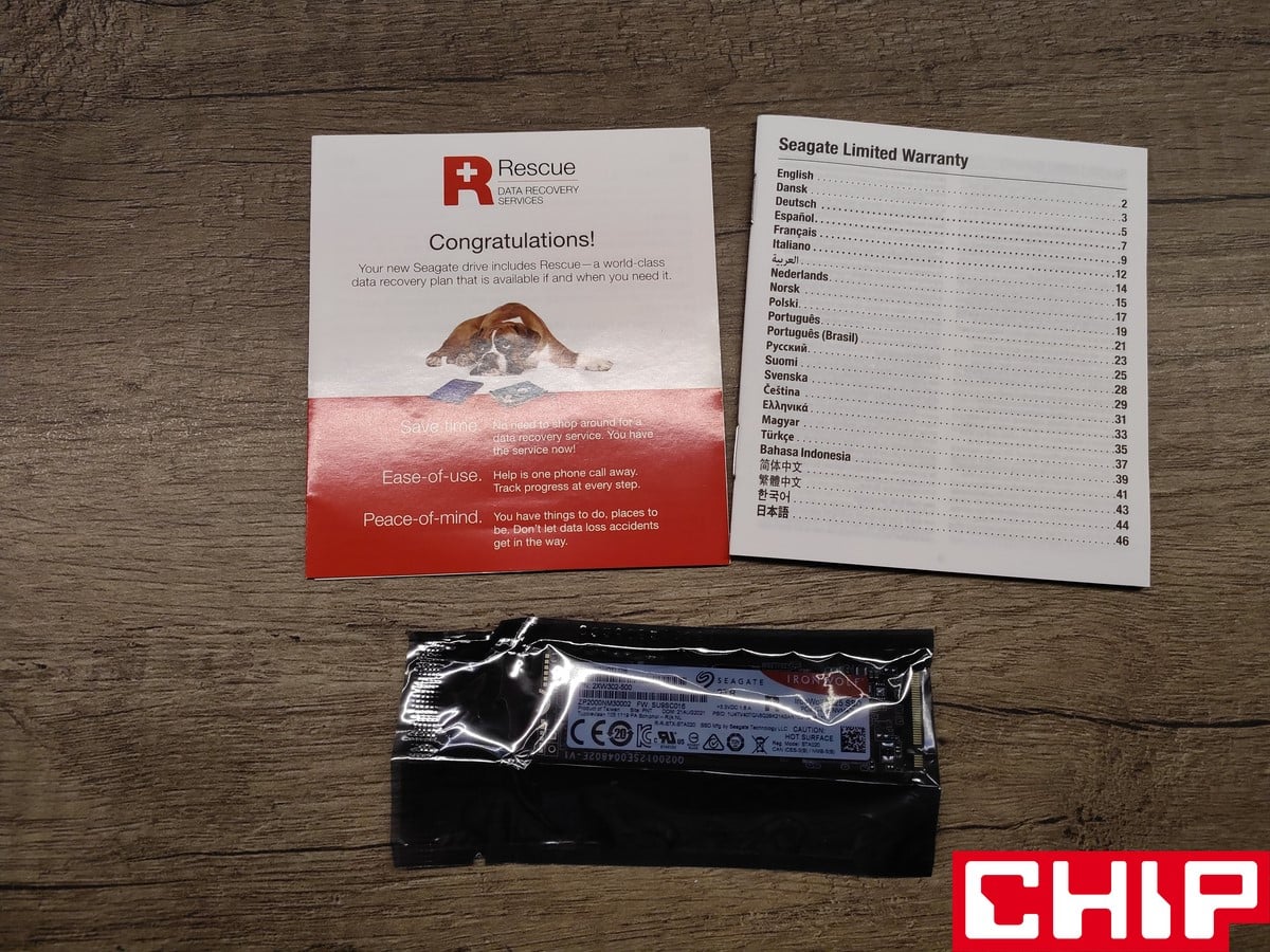 Seagate IronWolf 525 trafia do nas w tradycyjnym dla dysków SSD pudełeczku z renderem groźnego wilka na przodzie, wzmianką o usłudze Rescue Data Recovery i szczegółową specyfikacją na krawędzi. Wewnątrz w prostym plastikowym etui znalazł się zarówno dysk, jak i dwie “książeczki” informacyjne, dotyczące zarówno dysku, jak i samej usługi. Innymi słowy, to tradycyjny zestaw, towarzyszący SSD na M.2.
