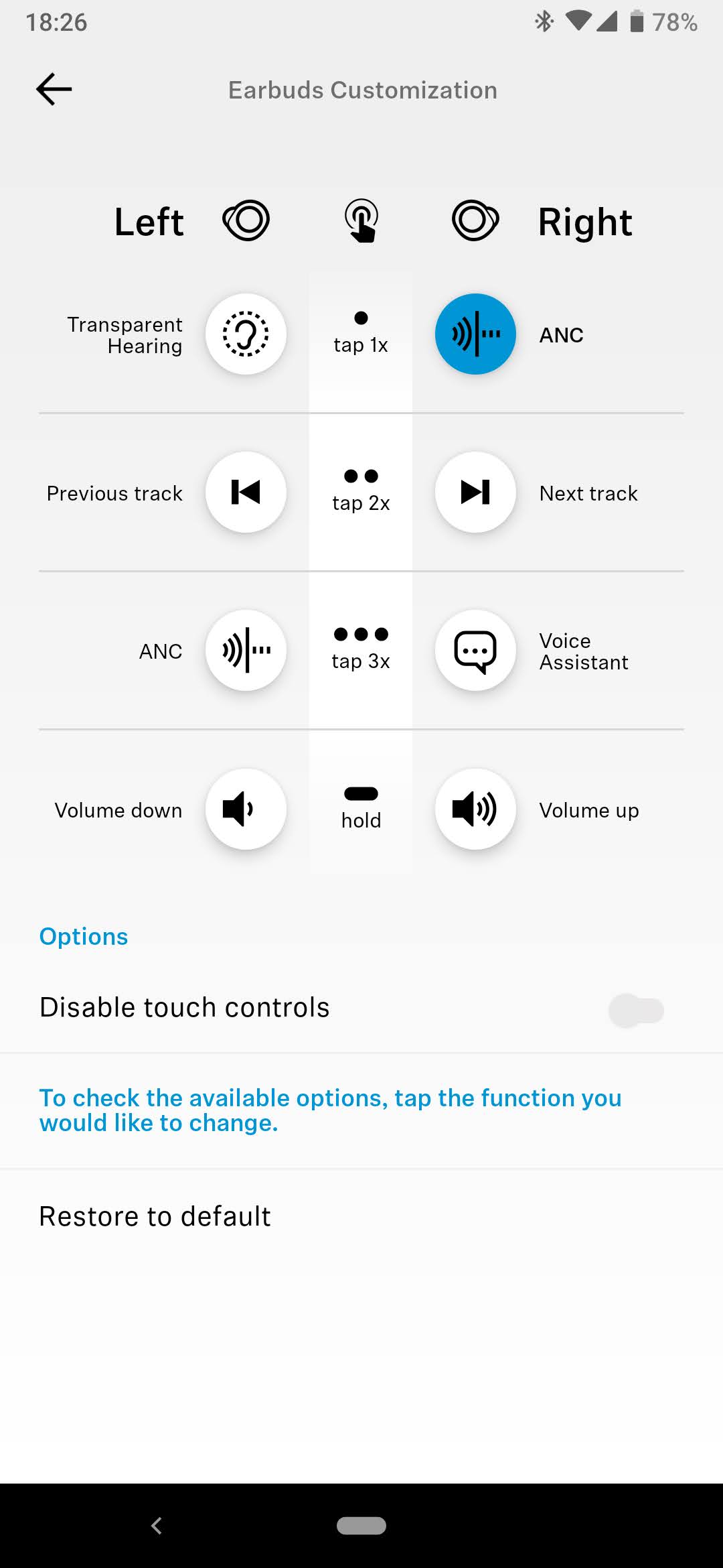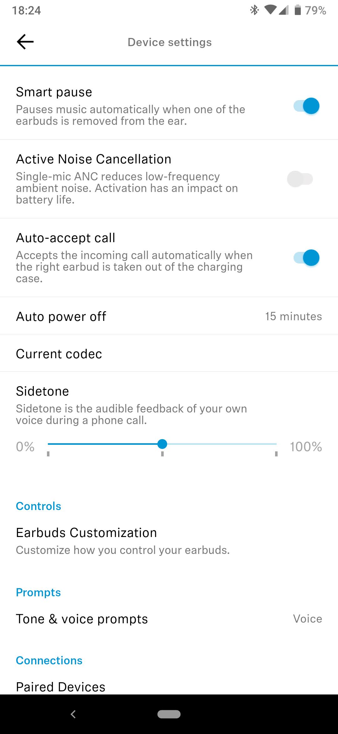 Wśród tych najważniejszych mowa o automatycznym zatrzymywaniu/wznawawianiu odtwarzania przy wyjęciu/włożeniu słuchawki do ucha, automatycznym odbieraniu przychodzących połączeń przy wyciągniętej z etui prawej słuchawce, określaniu czasu dezaktywacji słuchawek bez połączenia, wskazania obecnego kodeka, ustawienia nasilenia “słyszenia samego siebie” podczas rozmów, czy określenia tego, jak słuchawki będą dawać nam znać co do swojego stanu.
