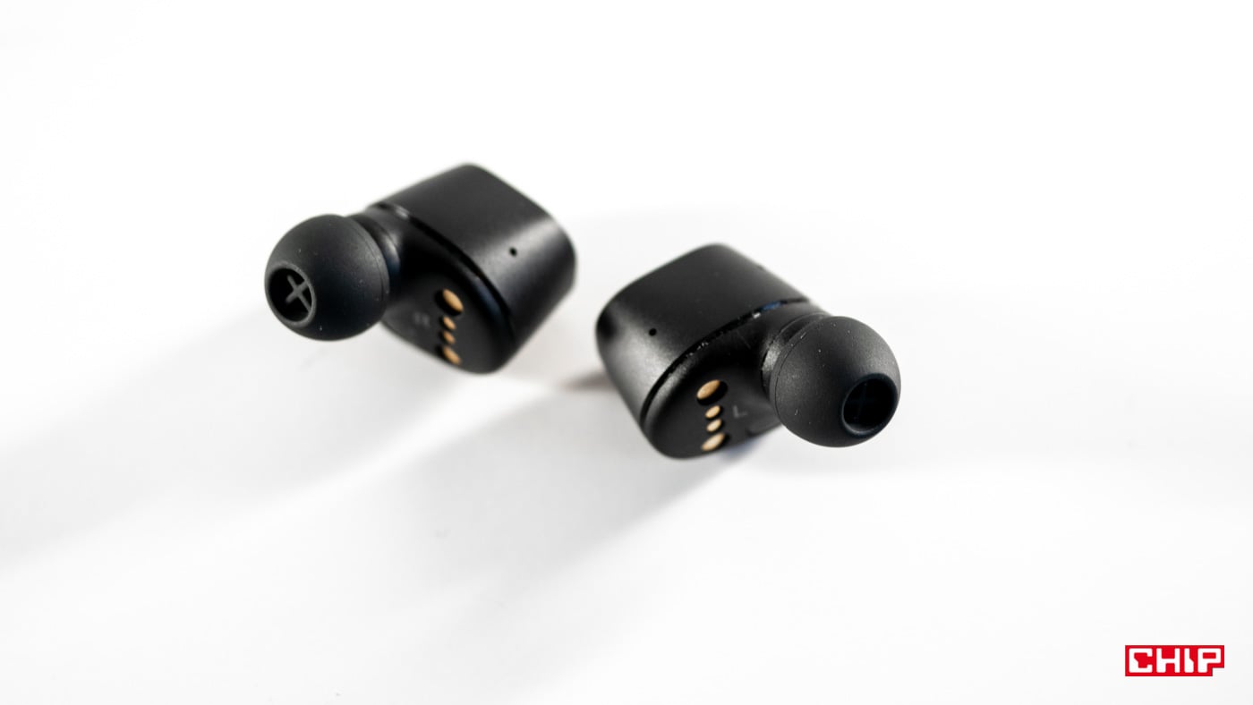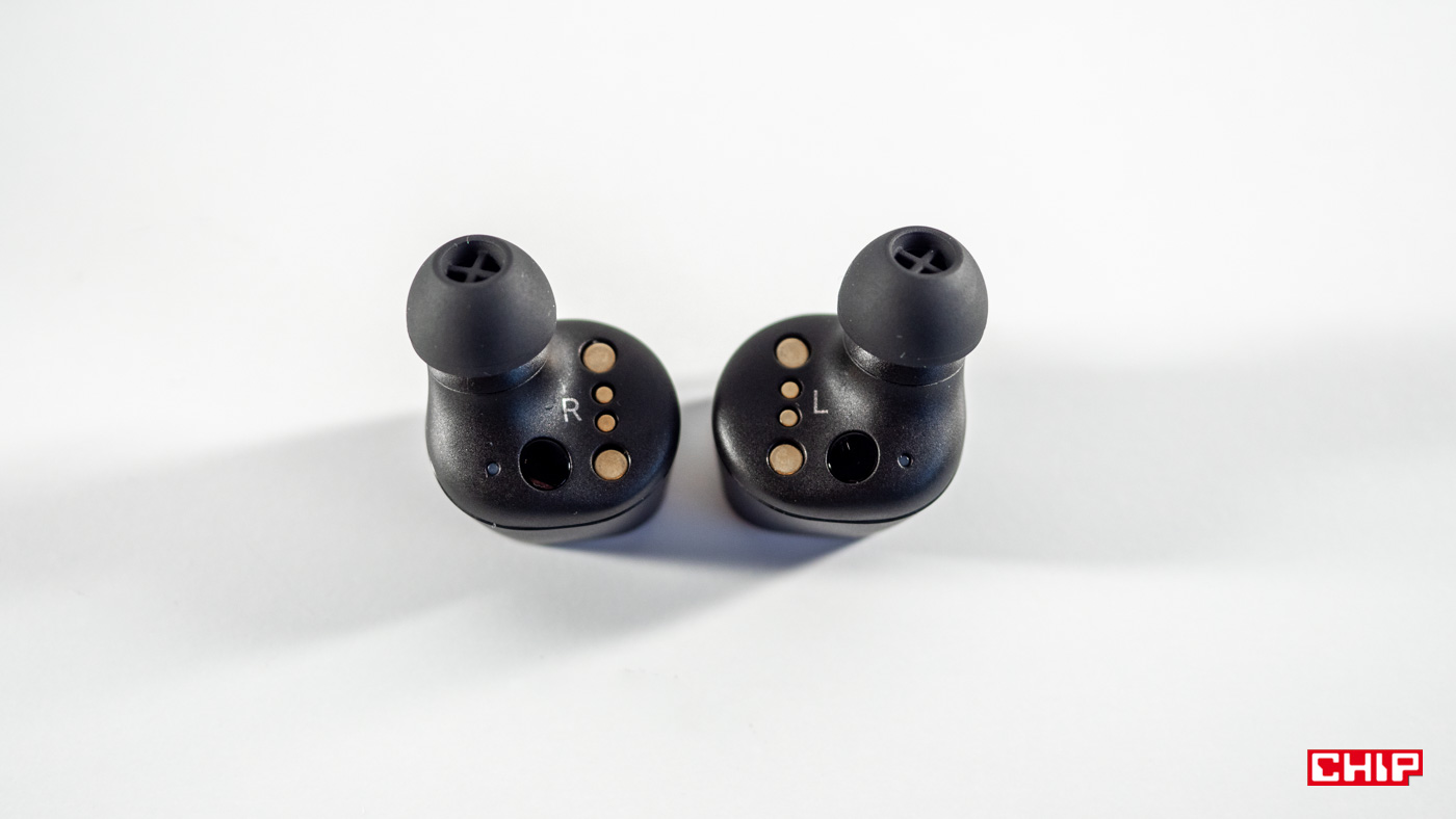 Po wewnętrznej stronie CX Plus znajdziemy dwa styki ładujące, dwa odsłonięte magnesy, czujnik obecności słuchawek w uszach (to ten mały, odznaczający się krążek), diodę funkcyjną oraz literkę L/R w oczywistym celu. Chociaż każda ze słuchawek składa się z trzech głównych elementów oddzielonych zauważalnymi spoinami, to chwalą się one wodoodpornością IPX4, czyli tą na zachlapania.