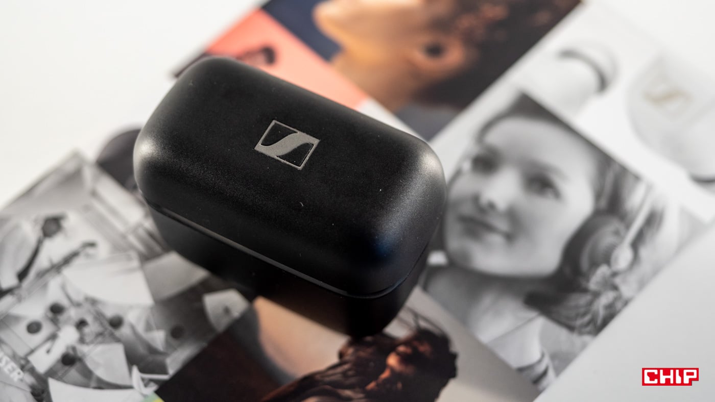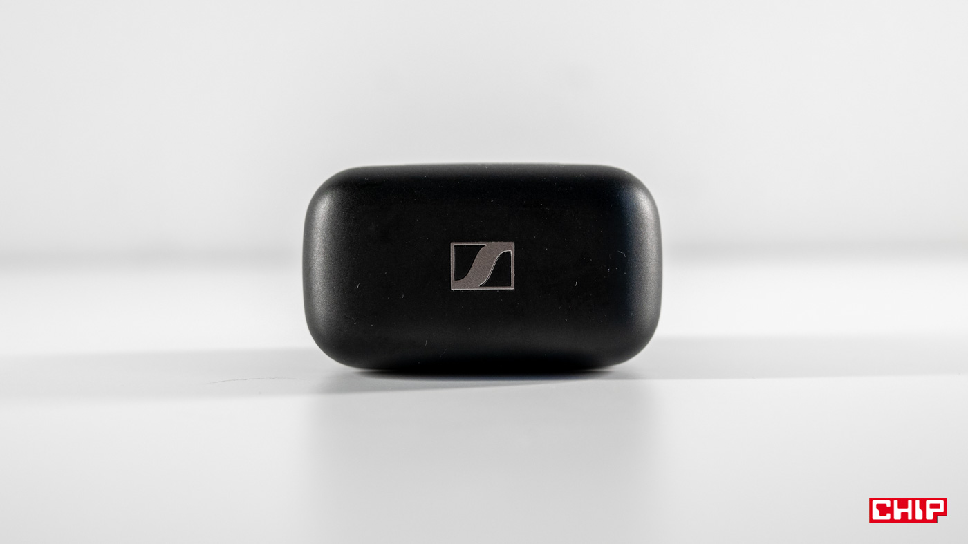 Etui przypomina wyglądem malutką obłą szkatułkę o minimalistycznym wyglądzie, którego uzupełnia tylko srebrne logo producenta na wieczku i plastik typu glossy między dwoma elementami. Można je wprawdzie otworzyć i zamknąć jedną dłonią, ale widać, że Sennheiser chciał, aby każde wykładanie i wkładanie słuchawek pozwalało otoczeniu rzucić okiem na to, co akurat macie w rękach. Samo w sobie mierzy 59 x 33,8 x 42,3 mm, co sprawia, że może nie jest najbardziej kompaktowe na rynku, ale powinno zmieścić się do każdej luźniejszej kieszeni. Nie powinniście jednocześnie bać się wrzucać jej do torby, czy plecaka, bo matowe tworzywo sztuczne, z którego zostało wykonane, jest wytrzymałe na zarysowania i otarcia.