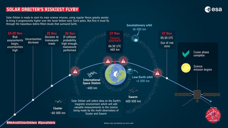 27 listopada sonda znajdzie się w odległości 460 kilometrów od powierzchni naszej planety. Będzie więc nieco powyżej orbity, po której porusza się Międzynarodowa Stacja Kosmiczna. O tym jak tłoczno jest w tych rejonach mogą świadczyć niedawne wydarzenia z udziałem Rosjan i użytej przez nich broni antysatelitarnej. Doprowadziło to do rozpadu jednego z satelitów na tysiące części – odłamki te spowodowały pojawienie się scenariusza, w którym rozważano ewakuację załogi przebywającej na pokładzie ISS.