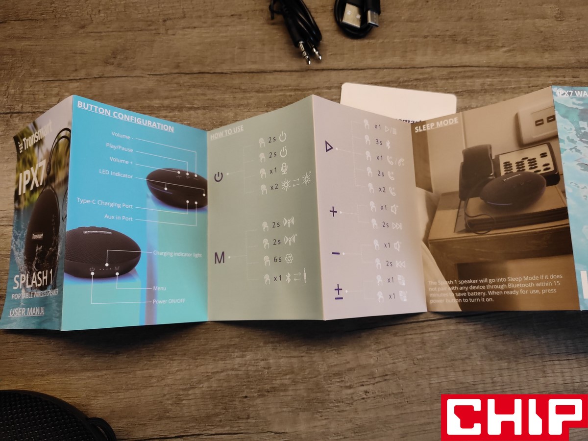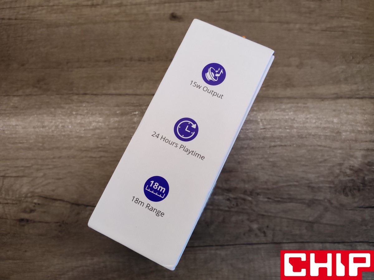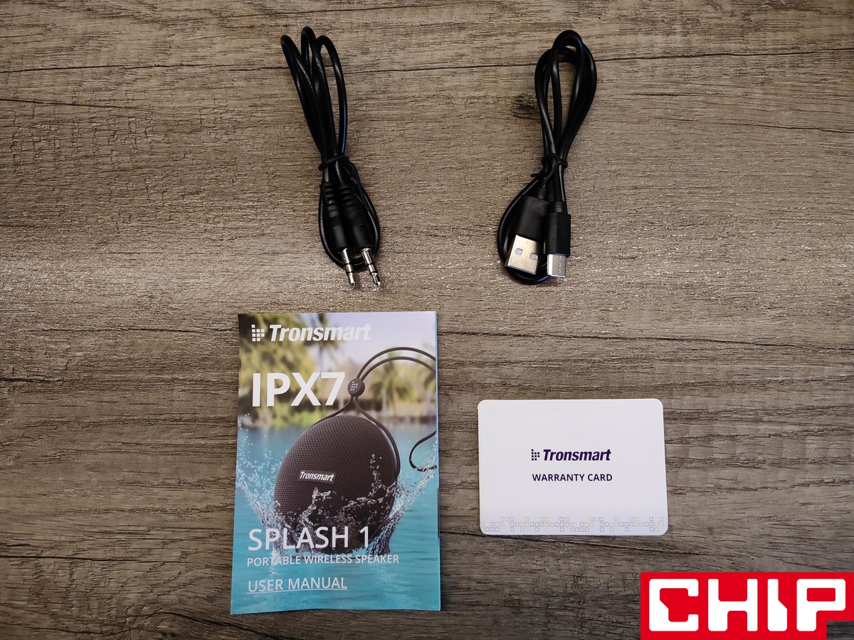 Jak to na bezprzewodowy głośnik z myślą o rozrywce i aktywności przystało, Splash 1 prezentuje sobą bardziej sportowy i “turystyczny” design. Zanim jednak położymy na niego dłonie, będziemy musieli poradzić sobie z unboxingiem solidnego kartonowego pudełka, które informuje nas o najważniejszych cechach głośnika poprzez proste infografiki. Wewnątrz oprócz Splash 1 znajdziemy instrukcję obsługi, kartę gwarancyjną i dwa około 60-centymetrowe proste przewody w gumowych osłonkach. Jeden jest przeznaczony do ładowania (USB-C do USB-A), a drugi do trybu przewodowego (zakończony 3-polowe jack 3,5 mm).