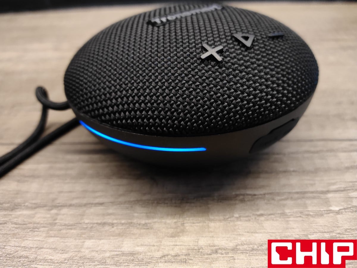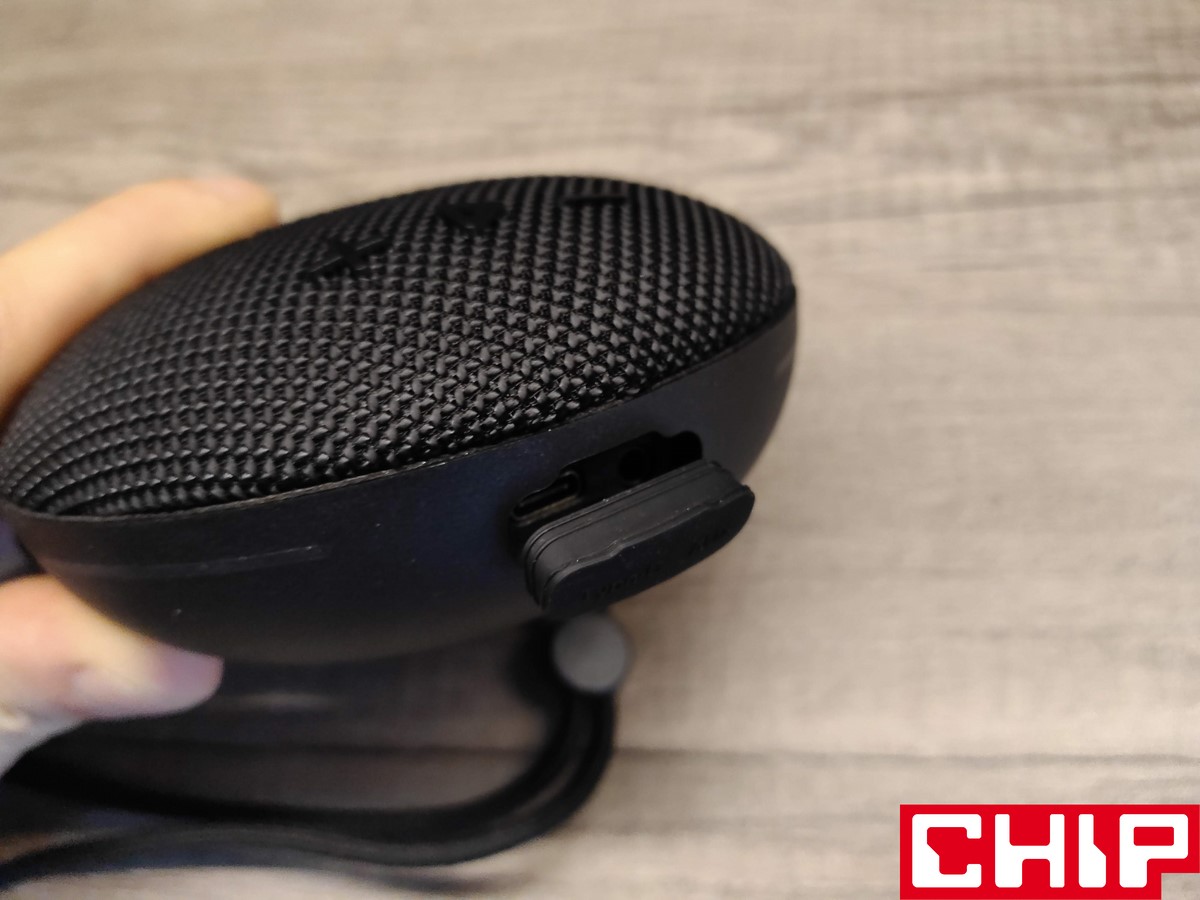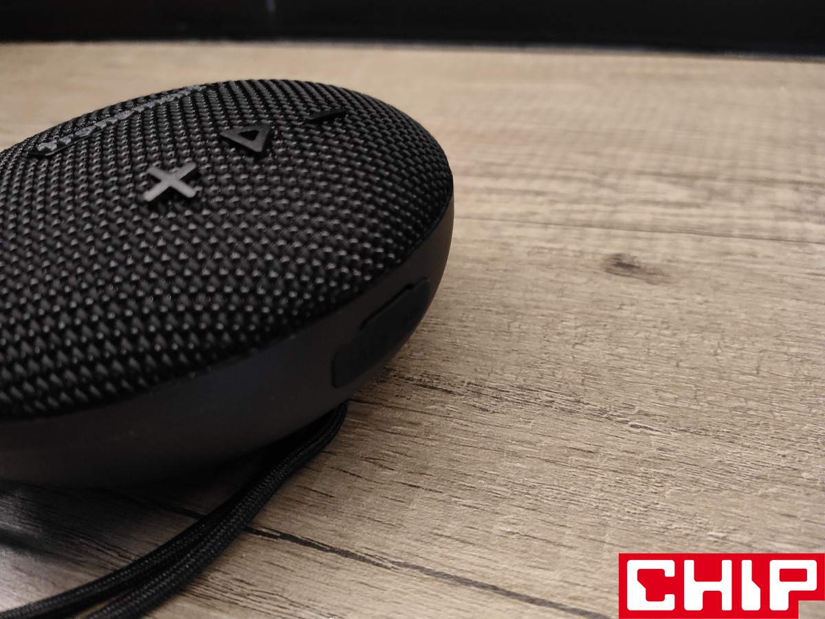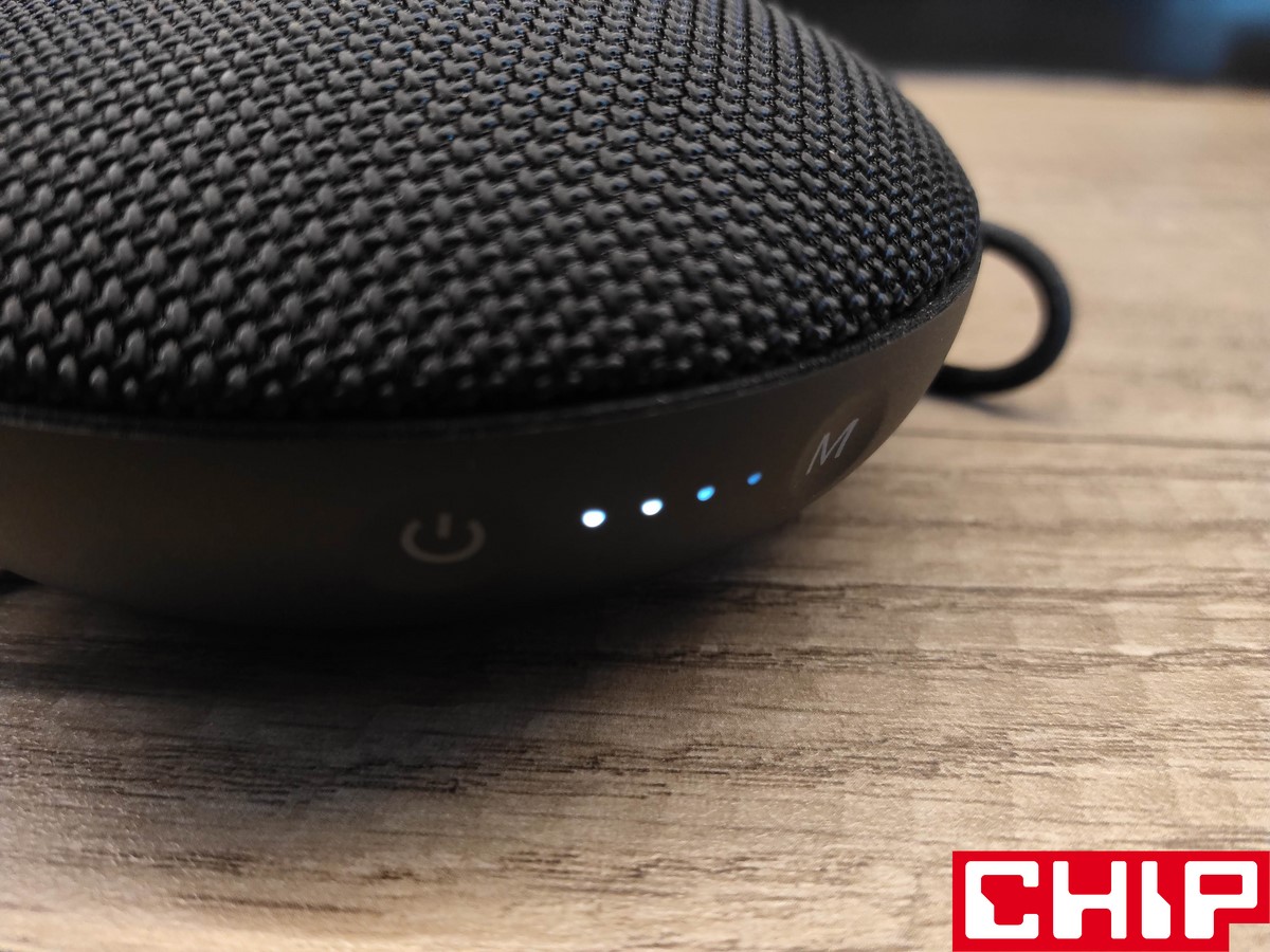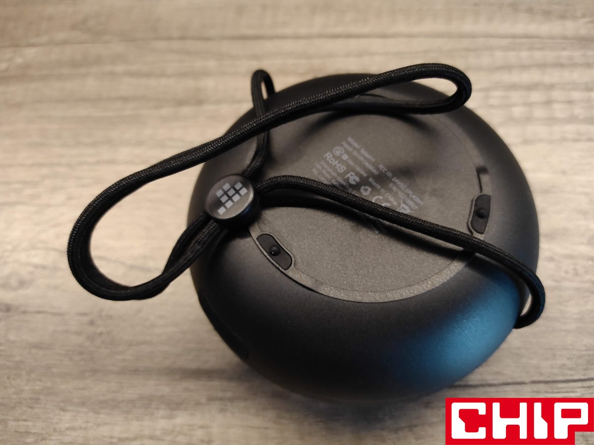 Jest jednak wykonany dosyć solidnie, bo w grę wchodzi podstawa z twardego plastiku, którą połączono z siatką o oczkach wypełnionych nylonową nicią. Spokojnie jednak – dźwięk nie sprawia wrażenia przytłumionego, a sama woda przedostaje się do środka bez najmniejszego oporu, co tyczy się też jej “przygody” w drugą stronę. Po stronie wyposażenia w grę wchodzi materiałowy, czyli długo schnący sznurek z przesuwną blokadą, trzy ciężko działające przyciski zarządzania multimediami na wierzchu i dwa funkcyjne (on/off oraz menu) na boku, które działają już znacznie przyjemniej. Między nimi znalazły się również cztery nieustannie świecące na biało diody, informujące nas o poziomie naładowania wbudowanego akumulatora.