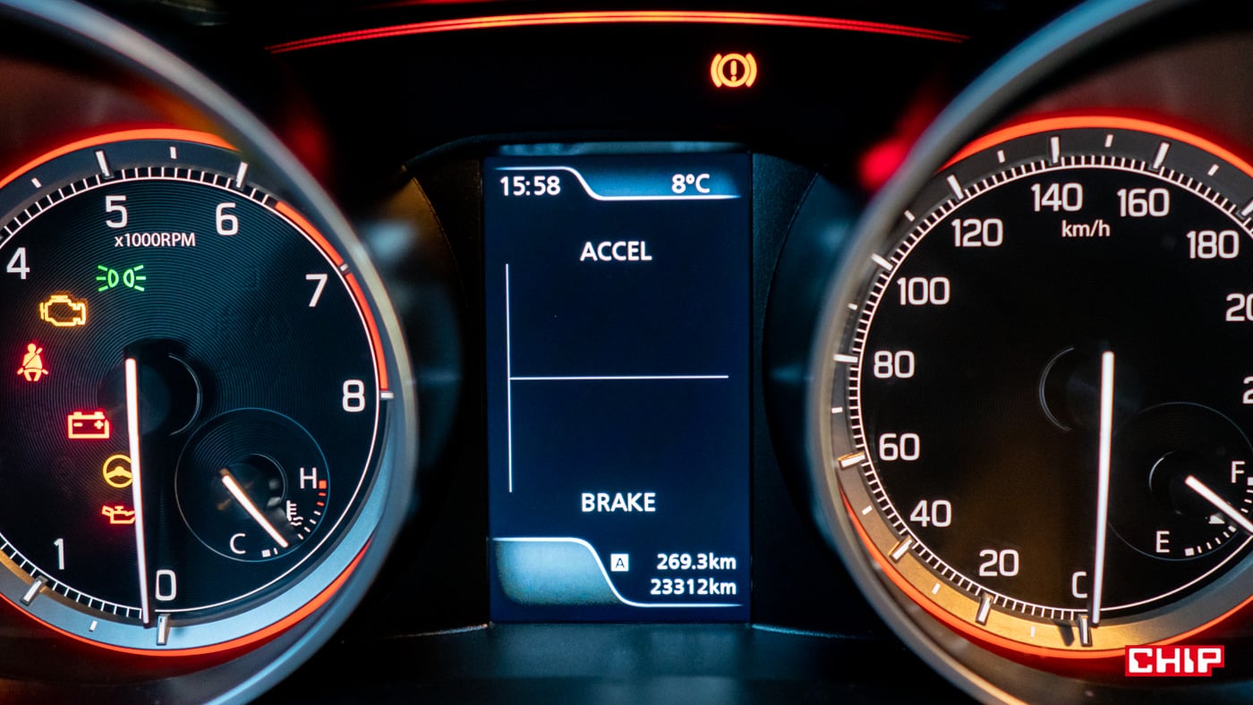 Wszelkie ustawienia dotyczące samego auta znajdziemy na ekranie kierowcy. O ile uda nam się dostać do Menu. A to nie jest taka prosta sprawa. Jeszcze jakoś wykombinujemy, że wymaga to przytrzymania guzika na kierownicy, ale odkrycie sposobu poruszania się po Menu zajęło mi dłuższą chwilę. Nie robimy tego strzałkami na kierownicy, a malutkim pokrętłem umieszczonym obok zegarów. Jest to naprawdę pokręcone. Za to samo Menu, choć po angielsku, jest łopatologicznie proste i łatwo można się w nim odnaleźć.