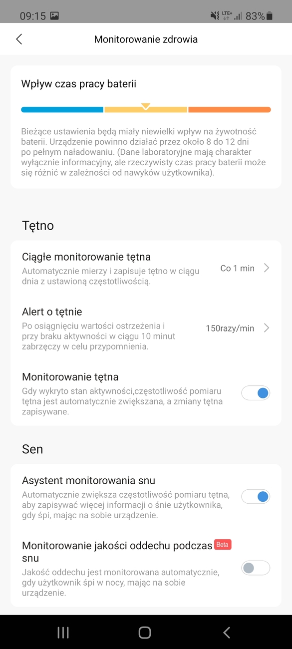 - Jest pomiar tętna w czasie rzeczywistym przez całą dobę. Działa, ale w mojej ocenie pomiary pulsu bywają przekłamane. Czasami smartband pokazywał mi tętno na poziomie 46 uderzeń na minutę, co raczej nie było możliwe.