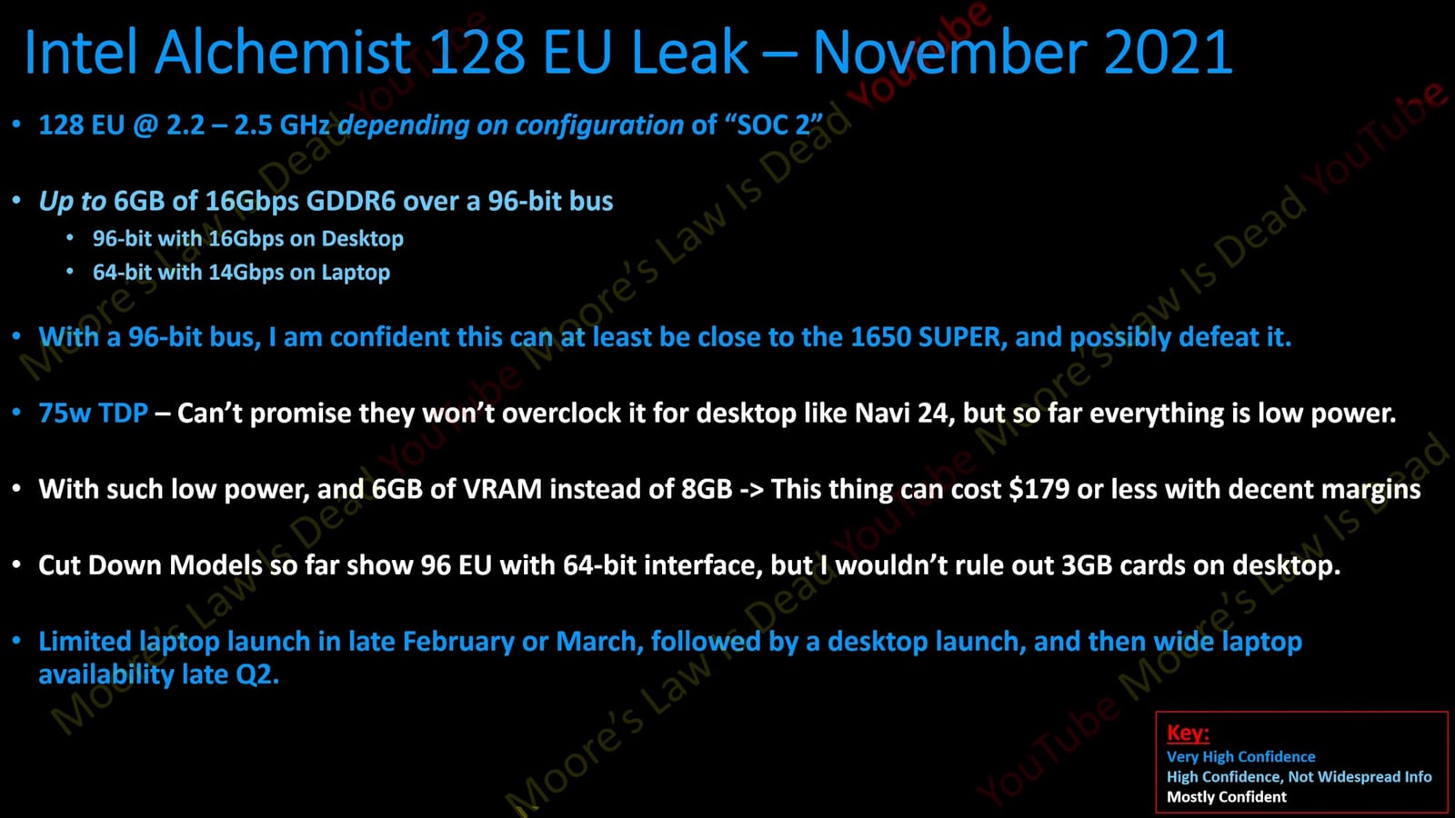 Stacjonarny wariant Arc Alchemist z GPU DG2-128EU ma być wyposażony w 6 GB pamięci GDDR6 i 96-bitową magistralę pamięci. Z kolei na rynek mobilny ma zawitać wersja z 4 GB GDDR6 (a nawet dodatkowo 3 GB) na 64-bitowej magistrali. Ponoć TDP tego GPU ma wynosić 75 watów, ale szczegóły pokroju cen, taktowania, czy wydajności, są na ten moment nieznane.