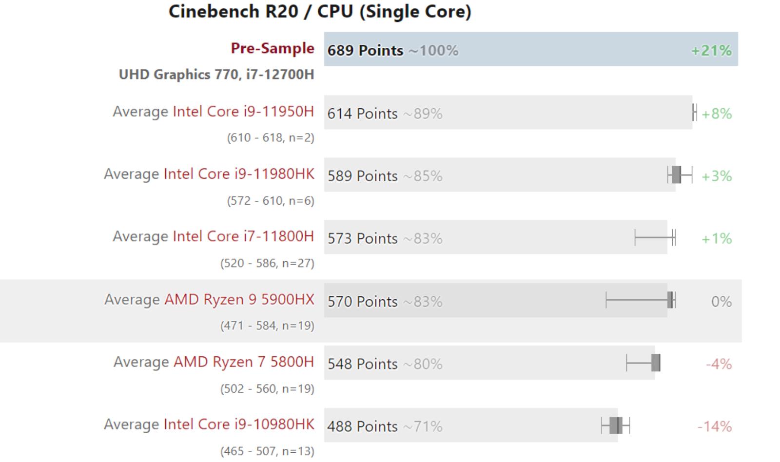 Wedle serwisu Notebookcheck dane pochodzą z zamkniętych testów MSI i najpewniej dotyczą flagowego laptopa gamingowego firmy o nazwie GE76 Raider. W tym sprawdzianie możliwości Core i7-12700H procesor zdobył 689 punktów w jednowątkowym teście i 7158 punktów w teście wielowątkowym Cinbench R20. Z kolei wydajność Cinbench R23 opiewała na 18501 punktów z udziałem wielu wątków.