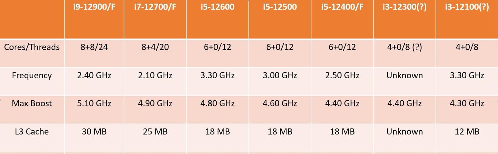 Tuż pod nim w hierarchii uplasuje się Intel Core i7-12700 z dezaktywowaną połową rdzeni Efficiency, co sprawi, że zaoferuje 12 rdzeni i 20 wątków. Ten procesor ma być taktowany o 200-300 MHz niżej względem i9-12900 i tak też jego taktowanie bazowe sięgnie 2,1 GHz, a to Boost 4,9 GHz. Są też szanse, że doczekamy się dwóch procesorów z serii i3, ale najnowsze informacje w ogóle o nich nie wspominają.