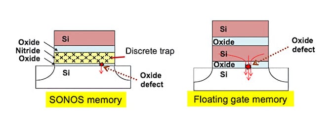 Różnica jest więc ogromna, a tak znaczące ulepszenie nie bierze się znikąd. Wszystko sprowadza się do budujących kość Flash komórek SONOS, których nazwa jest akronimem od ich składu (via Anandtech). Mowa kolejno o krzemie, ditlenku krzemu, azotku krzemu, ditlenku krzemu i znów krzemie. Ich produkcja ma być ponoć tańsza niż może się wydawać na pierwszy rzut oka.
